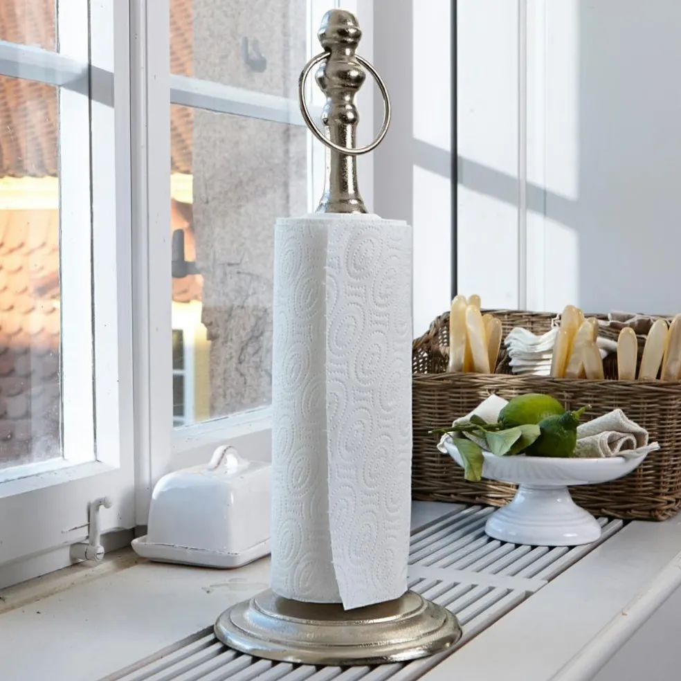 Dieses Schmuckstück ist der Beweis dafür, dass auch Küchenrollenhalter mit einem eleganten Design aufwarten können. Unser formschönes Modell wird aus reinem Aluminium gefertigt und wirkt durch das Antiksilber-Finish besonders attraktiv. Ein charmanter Tragering rundet den hochwertigen Gesamteindruck ab.