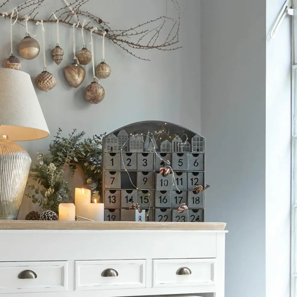 Ein kunstvolles und detailreiches Design aus Eisen mit einer sehr dekorativen Mini-Stadt ziert den edlen Adventskalender. Die Häuschen sind fein ausgestanzt, ebenso wie die Ziffern auf den 24 ausziehbaren, kleinen Fächern. Eine Lichterkette mit 30 warmweißen LEDs taucht sie in eine stilechte Weihnachtsstimmung. Die 24 Türchen lassen sich individuell befüllen, sodass Sie Ihre Lieben ganz persönlich überraschen können. Schmuckstücke oder Zuckerwerk – werden Sie kreativ. Das langlebige Modell kann alle Jahre wieder verwendet werden, was es sehr nachhaltig macht. Zudem entsteht so auch eine schöne Tradition. Beim Anblick des hübschen Städtchens kann man ins Träumen kommen – ein romantischer Weihnachtsbummel im Schnee oder Weihnachtswichtel, die fleißig Geschenke verteilen? Lassen Sie Ihrer Phantasie freien Lauf und genießen Sie die Weihnachtszeit mit diesem wertvollen Schmuckstück in vollen Zügen. Oder verschenken Sie den Adventskalender an Ihre Liebsten. Die Stadt wird mit Batteriebetrieb erleuchtet, ganz ohne störende Kabel.