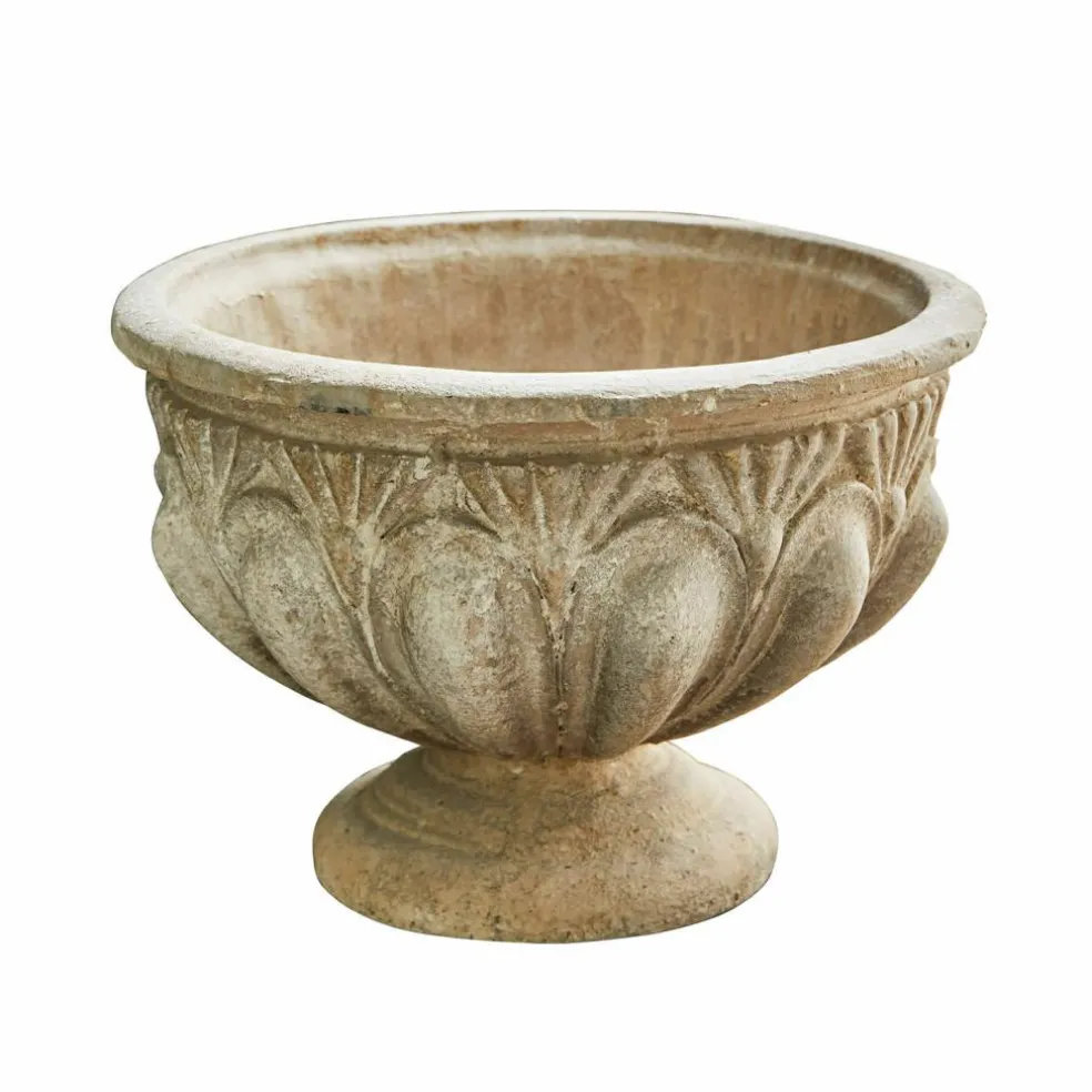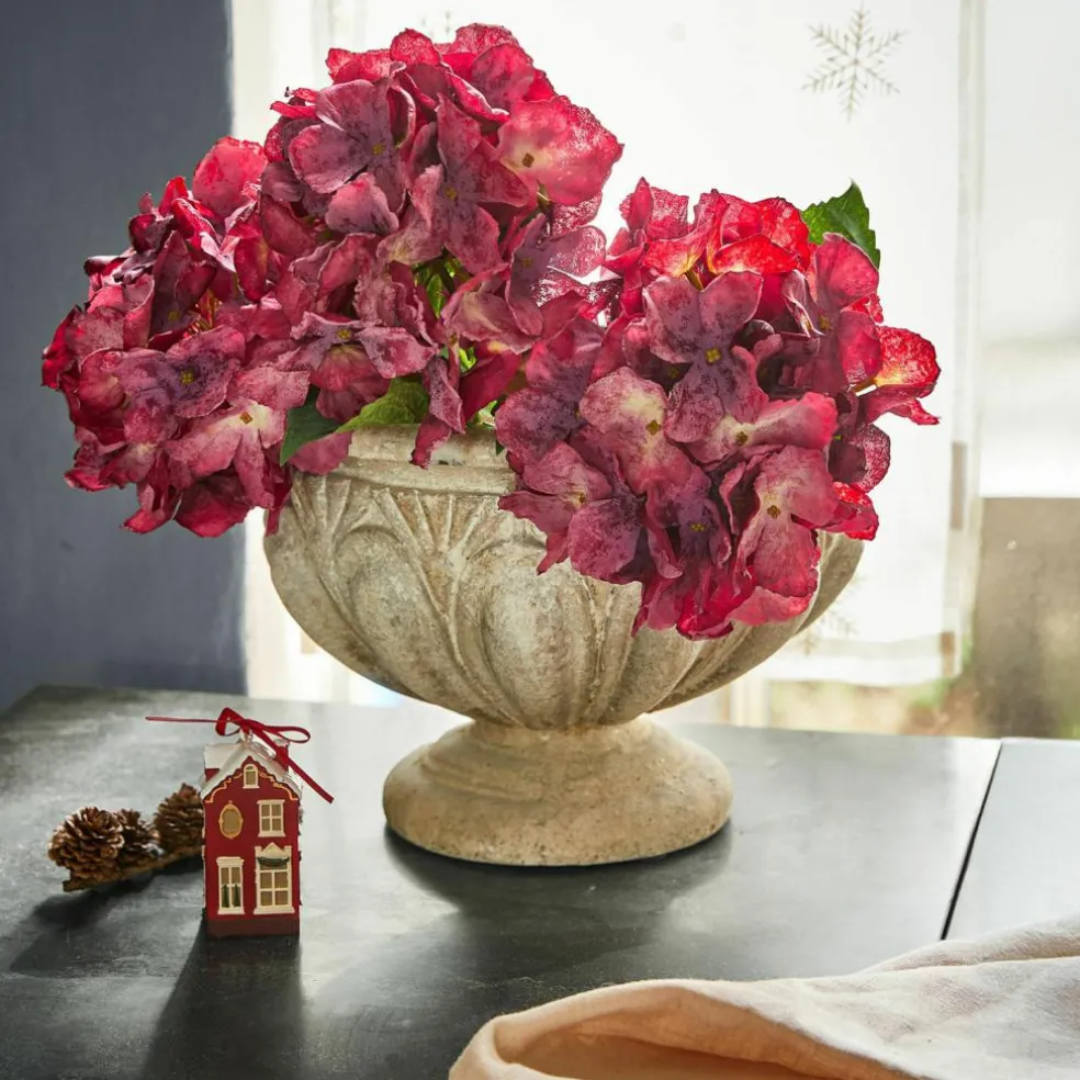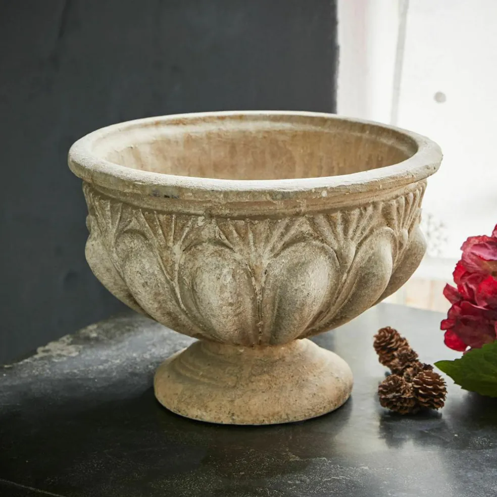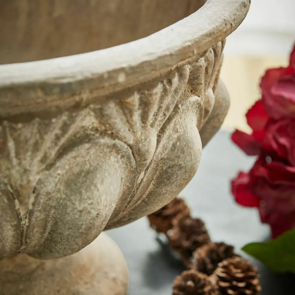 Wie ein Fundstück aus längst vergangener Zeit wirkt diese Amphore – und genau darin liegt ihr Zauber. Gefertigt aus Kunststein mit verwittertem Finish und feiner Reliefverzierung, strahlt sie eine Ruhe und Zeitlosigkeit aus, die sofort fasziniert. Der bauchige Korpus mit antikem Blütenmuster ruht sicher auf einem kleinen Sockel und verleiht Ihrem Arrangement eine klassische Bühne. Besonders schön für Trockenblumen, Naturmaterialien oder weihnachtliche Dekoideen – ob auf einem Kaminsims, einem gedeckten Tisch oder als Mittelpunkt einer Kommode. Diese Amphore erzählt Geschichten – und wird zum stillen Star Ihrer Raumgestaltung.