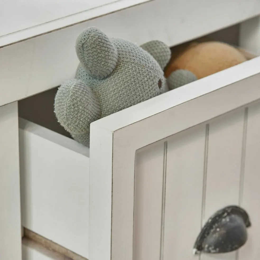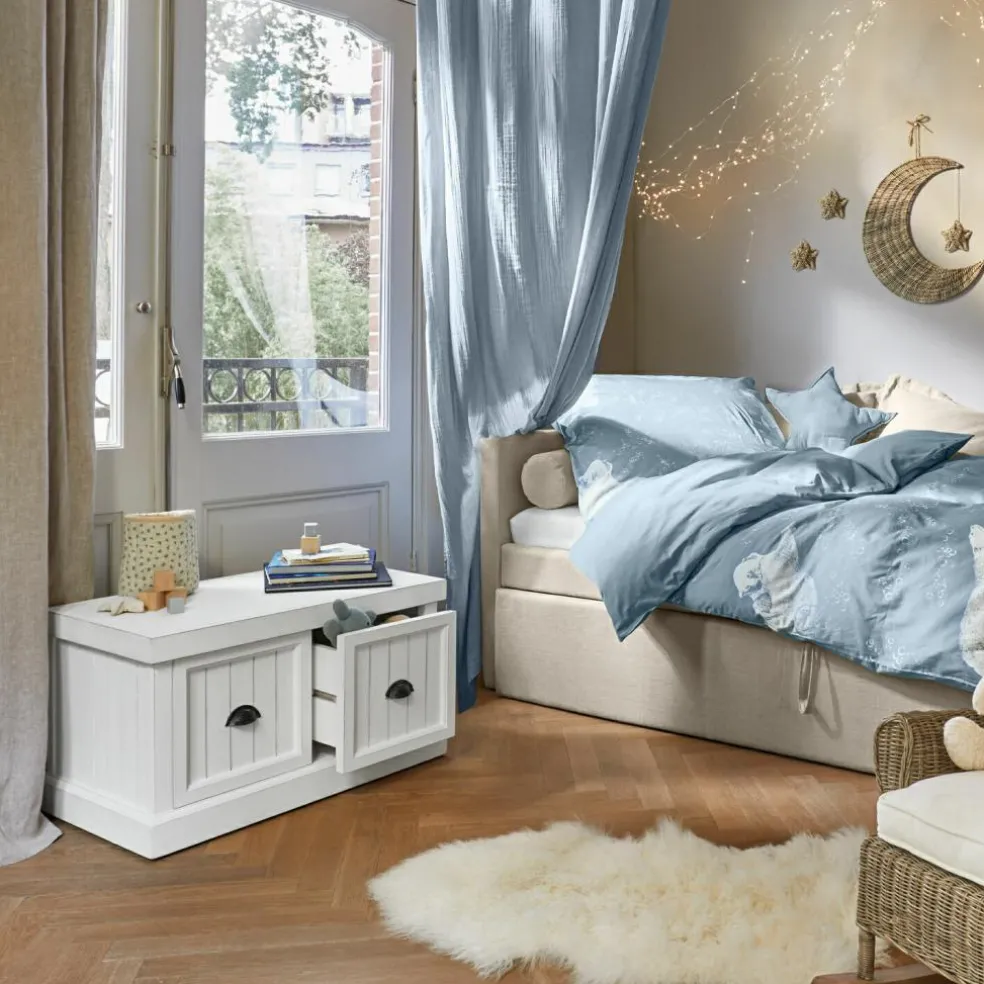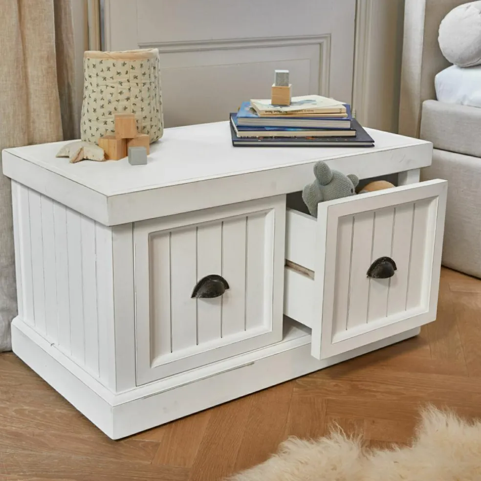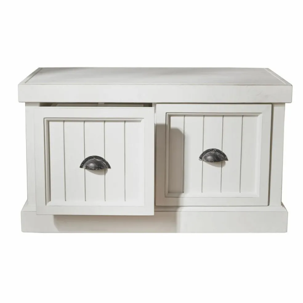 Diese wunderschöne Sitzbank vereint Funktionalität und ästhetische Anziehungskraft auf perfekte Weise. Hergestellt aus hochwertigem Mangoholz, strahlt sie mit ihrer natürlichen Maserung und dem weißen Landhausstil rustikalen Charme aus. Die zwei geräumigen Schubladen mit robusten Eisengriffen bieten praktischen Stauraum für Spielsachen, Schuhe oder andere Alltagsgegenstände. Diese Bank ist nicht nur eine stilvolle Sitzgelegenheit, sondern auch eine praktische Lösung für mehr Ordnung im Kinderzimmer oder Flur. Die sanften Linien und die angenehme Haptik des Mangoholzes machen sie zu einem zeitlosen Möbelstück, das Gemütlichkeit und Wärme in jeden Raum bringt.