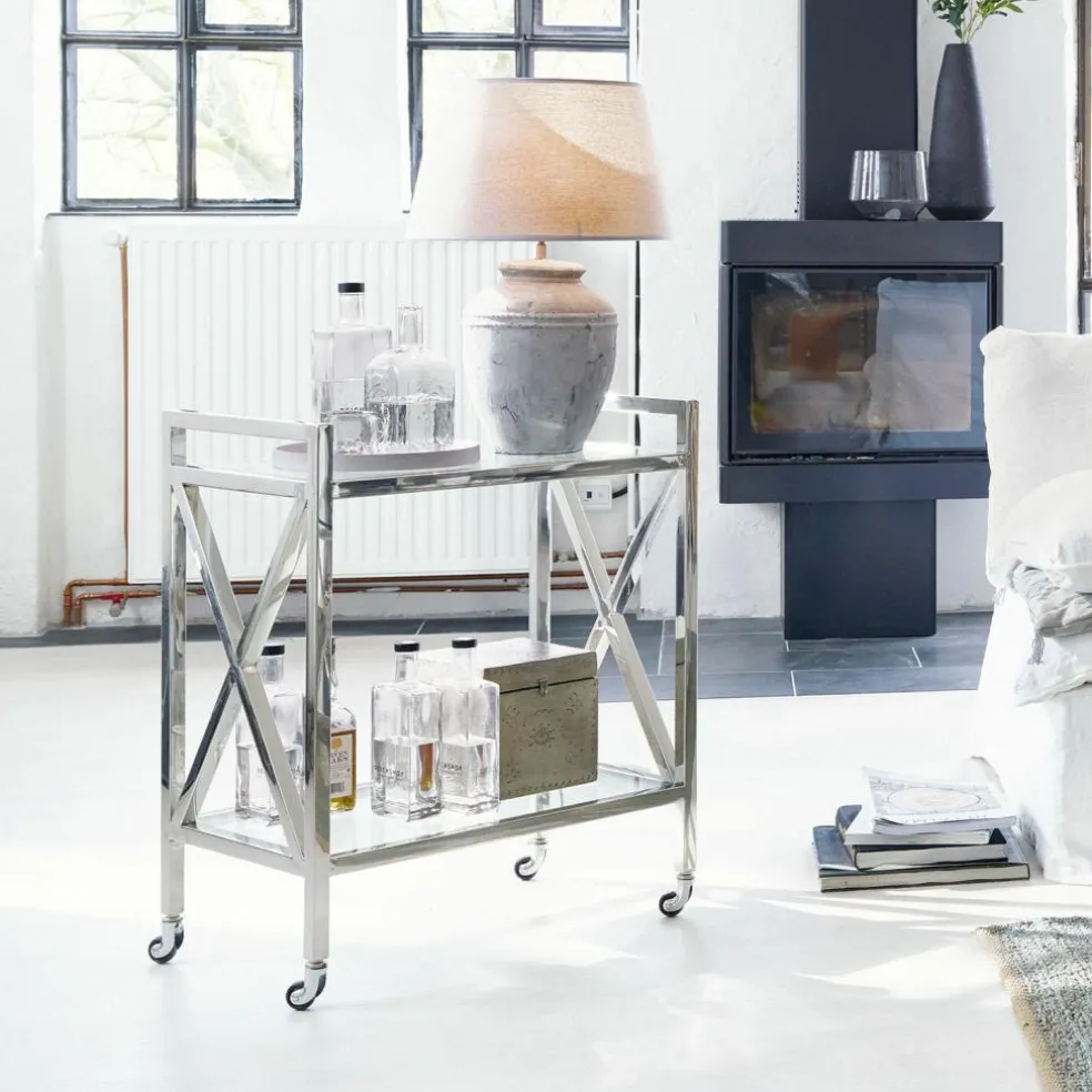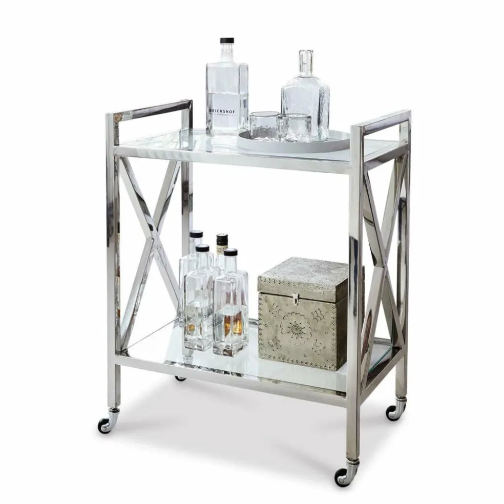 Es gibt Möbelstücke, über die könnte man stundenlang Geschichten erzählen. Wie zum Beispiel über den klassischen Barwagen, den wir Ihnen hier als Designer-Modell aus hochglänzendem Edelstahl mit Glas präsentieren können. Seinen Ursprung hat dieses luxuriöse Möbelstück im viktorianischen England, als die vornehmen Ladies ihren Freundinnen im Salon oder Garten den obligatorischen Tee und frisch gebackene Scones auf einem kleinen, fahrbaren Gefährt anboten. Diese mobile Servierhilfe war damals meist aus edlem Holz und mit großen Rädern ausgestattet und der Inbegriff der feinen Lebensart. Zu Beginn des 20. Jahrhunderts verwandelte sich der Teewagen in einen Barwagen und wurde mit seinem Angebot an erlesenen Whiskeys, Likören, Cognac und Co sofort zum umlagerten Mittelpunkt jeder Party. Dann verschwand er eine Weile von der Bildfläche, um jetzt – kantiger und geradliniger designt und aus modernem Edelstahl – in unser gesellschaftliches Leben zurückzurollen. Mal als gut sortierter Barwagen mit ausgewählten Spirituosen, mal als Servierhilfe mit Tee oder Kaffee, Kuchen oder köstlichem Fingerfood. Auf zwei stabilen Glasflächen bietet der Barwagen ausreichend Abstellfläche und mit Hilfe der leichtgängigen Rollen lässt er sich mühelos bewegen. Wird er nicht benötigt, kann er wie eine schmale Konsole ganz einfach an eine Wand gestellt werden und vielleicht Ihre individuellen Deko-Ideen präsentieren.