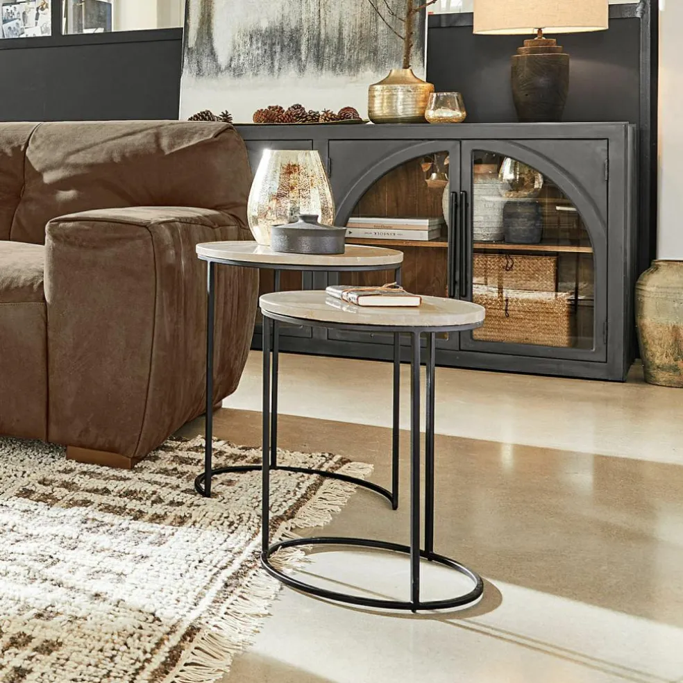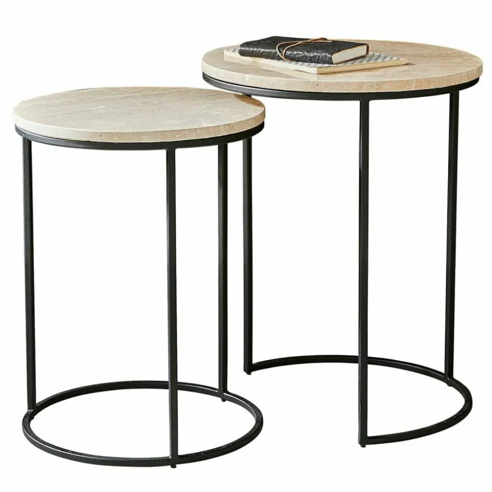 Dieses exquisite Beistelltisch-Set verleiht jedem Raum eine zeitlose Eleganz. Die Tischplatten aus Travertin sind nicht nur optisch ein Highlight, sondern auch haptisch ein Genuss – jede Platte ist ein Unikat, das durch seine individuelle Farbgebung und Musterung besticht. Das robuste Eisengestell sorgt für eine stabile und gleichzeitig filigrane Optik. Dank der ineinander schiebbaren Konstruktion bieten die Tische nicht nur eine stilvolle Ablagefläche, sondern auch eine praktische Lösung für platzsparendes Wohnen. Lassen Sie sich von der natürlichen Schönheit und der funktionalen Vielseitigkeit dieses Sets begeistern.