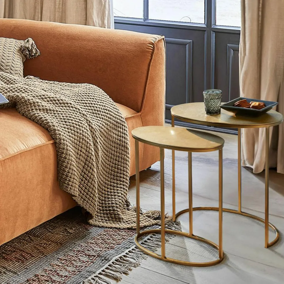 Dieses exquisite Beistelltisch-Set vereint luxuriöses Design und praktische Funktionalität. Die Tischplatten aus handgegossenem Aluguss strahlen in einem edlen Goldton und bieten eine beeindruckende Textur, die jedes Detail zur Geltung bringt. Das schlanke, aber stabile Gestell aus Eisen verleiht den Tischen eine moderne Eleganz, die sich nahtlos in jede Einrichtung einfügt. Besonders praktisch ist das ineinander stellbare Design, das sowohl Platz spart als auch vielseitige Einsatzmöglichkeiten bietet – ob als stilvolle Ablagefläche im Wohnzimmer oder als elegante Ergänzung im Schlafzimmer. Diese Tische sind nicht nur Möbelstücke, sondern Kunstwerke, die jedem Raum einen Hauch von Glamour verleihen.