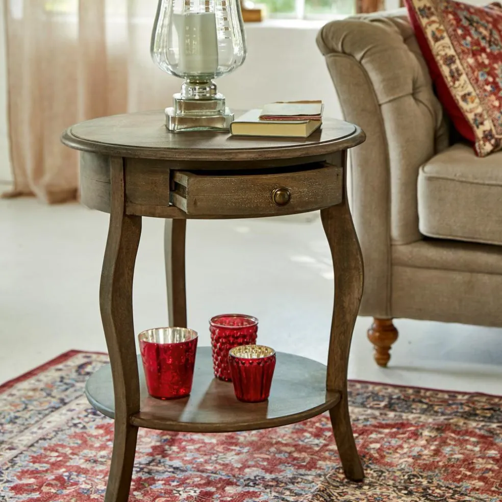 Hochwertige Eleganz mit nostalgischem Charakter. Der edle Beistelltisch ist von Hand gedrechselt und geschreinert. Er besteht aus wertvollem Mangoholz und bezaubert mit harmonischer Formgebung und geschwungenen Beinen. Das handliche Design findet auch in kleinen Räumen wunderbar Platz. Die leicht nostalgische Anmutung lässt ihn sehr gut zum Shabby-Chic aussehen. Das geschmackvolle Modell wirkt ein wenig wie ein seltenes Erbstück und hat ganz besonderen Charme. In der Schublade und auf der unteren Ablage bietet er einigen Stauraum.
