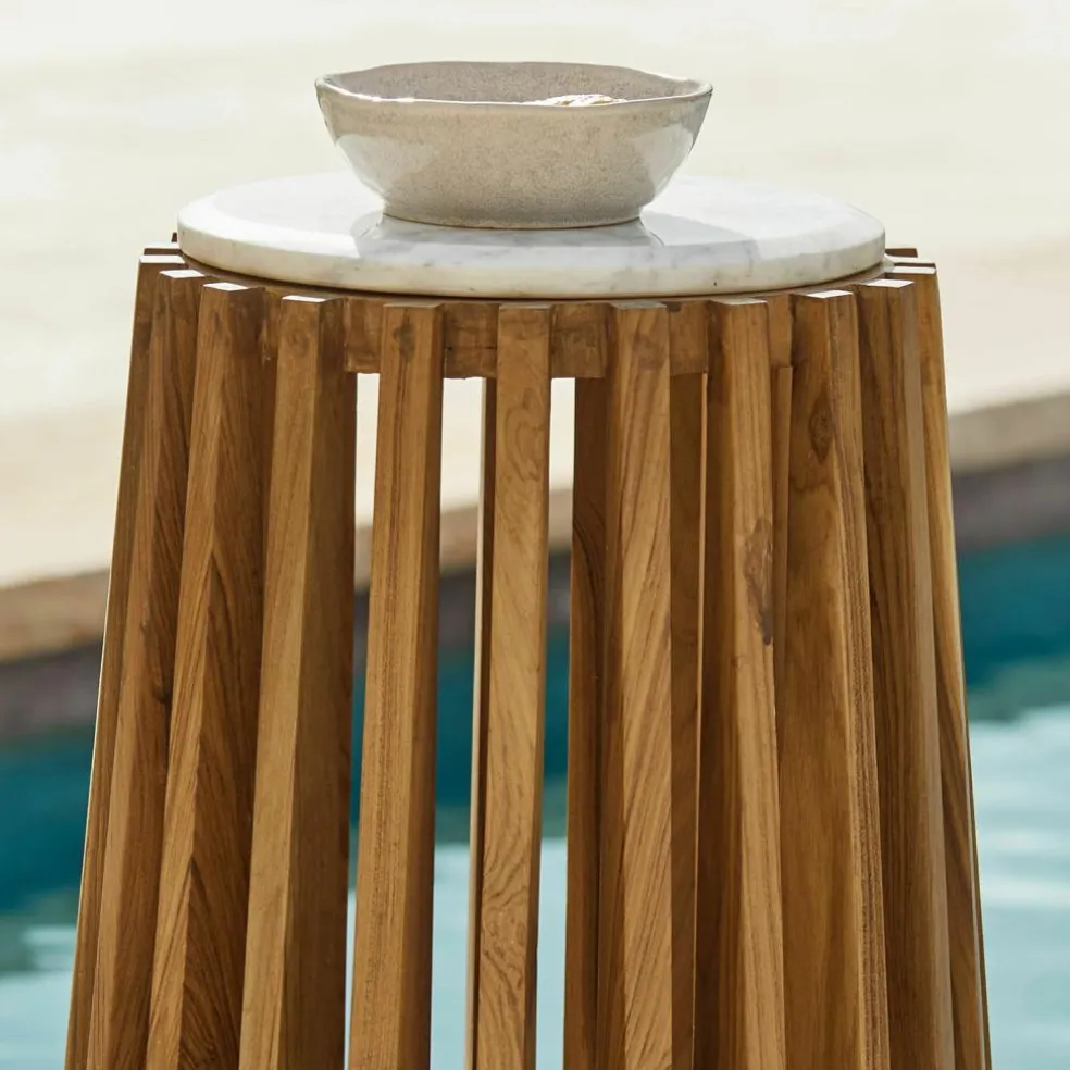 Dieser vielseitige Beistelltisch ist ein wahrer Blickfang, ob im Wohnbereich oder auf der Terrasse. Die offene Form aus naturbelassenem Teakholz verleiht dem Tisch eine luftige Leichtigkeit und stabilen Stand. Die runde Marmorplatte besticht durch individuelle Farbschattierungen und macht jeden Tisch zu einem Einzelstück. Dank wetterfester Materialien ist er ideal für den Einsatz im Freien geeignet und fügt Ihrem Außenbereich einen Hauch von Natur und zeitlosem Stil hinzu. Ein harmonisches Design, das organische Materialien und Funktionalität auf wunderbare Weise verbindet.