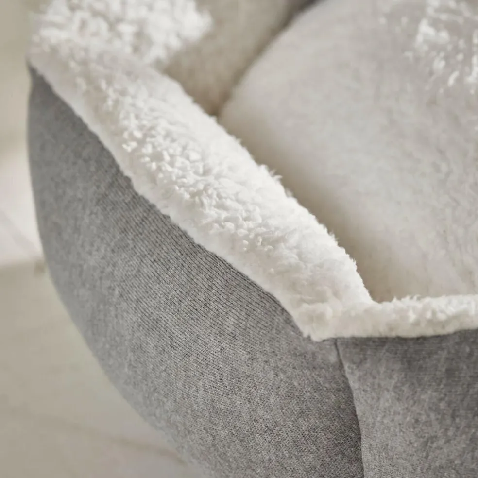 Dieses Haustierbett ist wie gemacht für ruhige Stunden, verträumtes Dösen und tiefenentspanntes Schlummern. Der Bezug aus Baumwolle zeigt sich außen in modernem Grau – dezent und wohnlich zugleich. Im Inneren erwartet Ihr Liebling ein weiches, cremefarbenes Polster mit flauschiger Oberfläche, das sofort Geborgenheit ausstrahlt. Die sechseckige Form mit leicht erhöhtem Rand schenkt Halt und ein Gefühl von Schutz, fast wie in einer kleinen Höhle. Die rutschfeste Unterseite verhindert lästiges Wegrutschen auf Fliesen oder Parkett – perfekt für lebhafte Vierbeiner. Und weil auch die Halterin oder der Halter mitgedacht wurde: Das Bett lässt sich ganz unkompliziert reinigen und bleibt dadurch lange frisch. Ein Lieblingsort, der das Zuhause auch optisch bereichert.