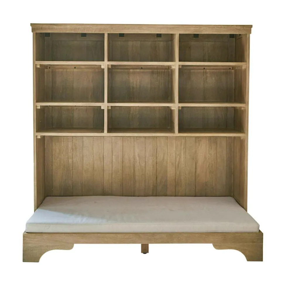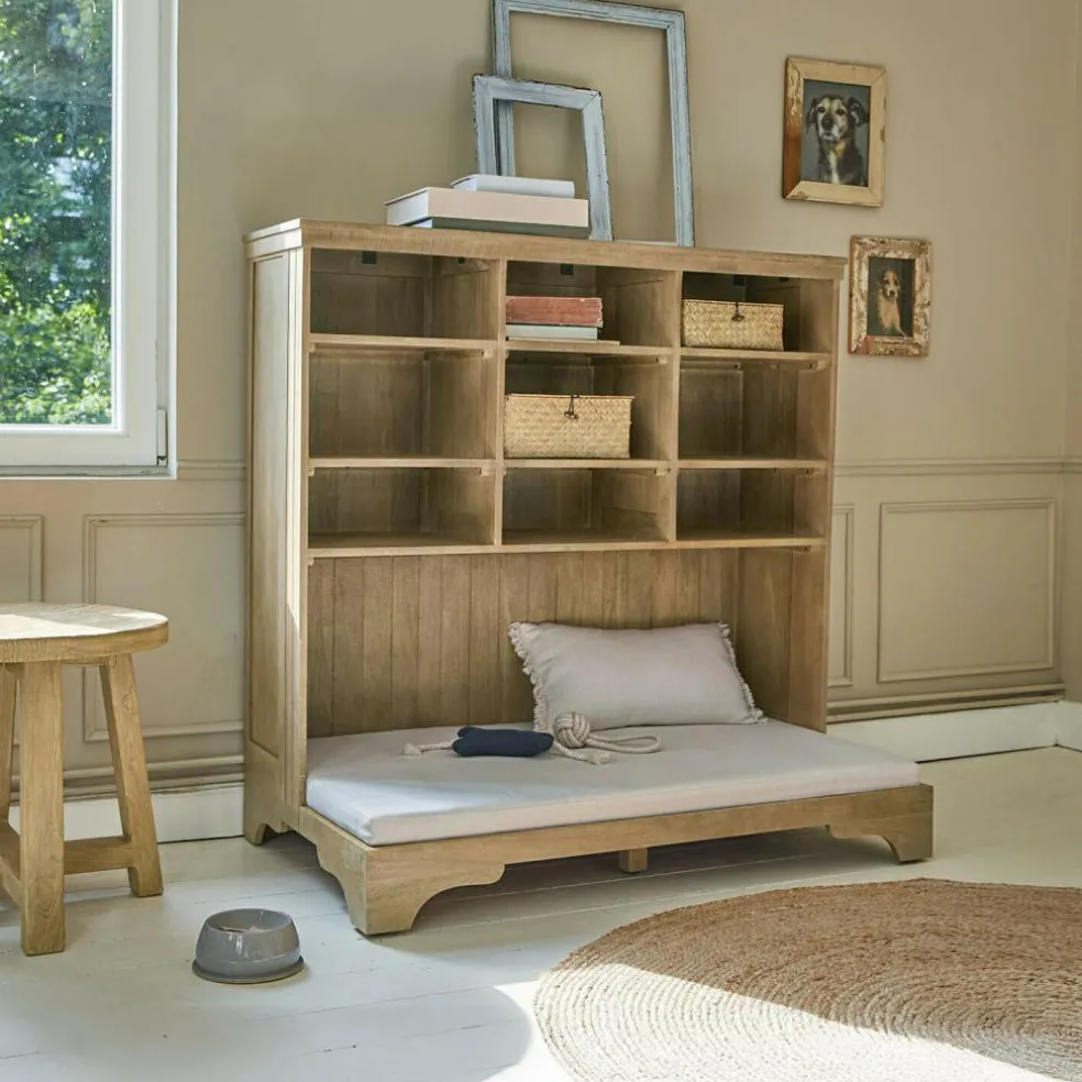 Ein Möbelstück, das mehr kann: Dieses charmante Regal aus massivem Mangoholz ist Rückzugsort und Aufbewahrung in einem. Während Ihr Hund oder Ihre Katze sich auf der bequemen Matratze mit waschbarem Baumwoll-Canvas-Bezug entspannt, schaffen die fest verbauten Regalböden darüber praktischen Stauraum. Ob Lieblingsbuch, Leine, Leckerlis oder Pfotentücher – alles Wichtige ist griffbereit und stilvoll verstaut. Der natürliche Holzton, die klare Form und die durchdachte Funktionalität machen dieses Möbel zum Herzstück Ihres Wohnraums – und zum Lieblingsplatz für Zwei- und Vierbeiner.