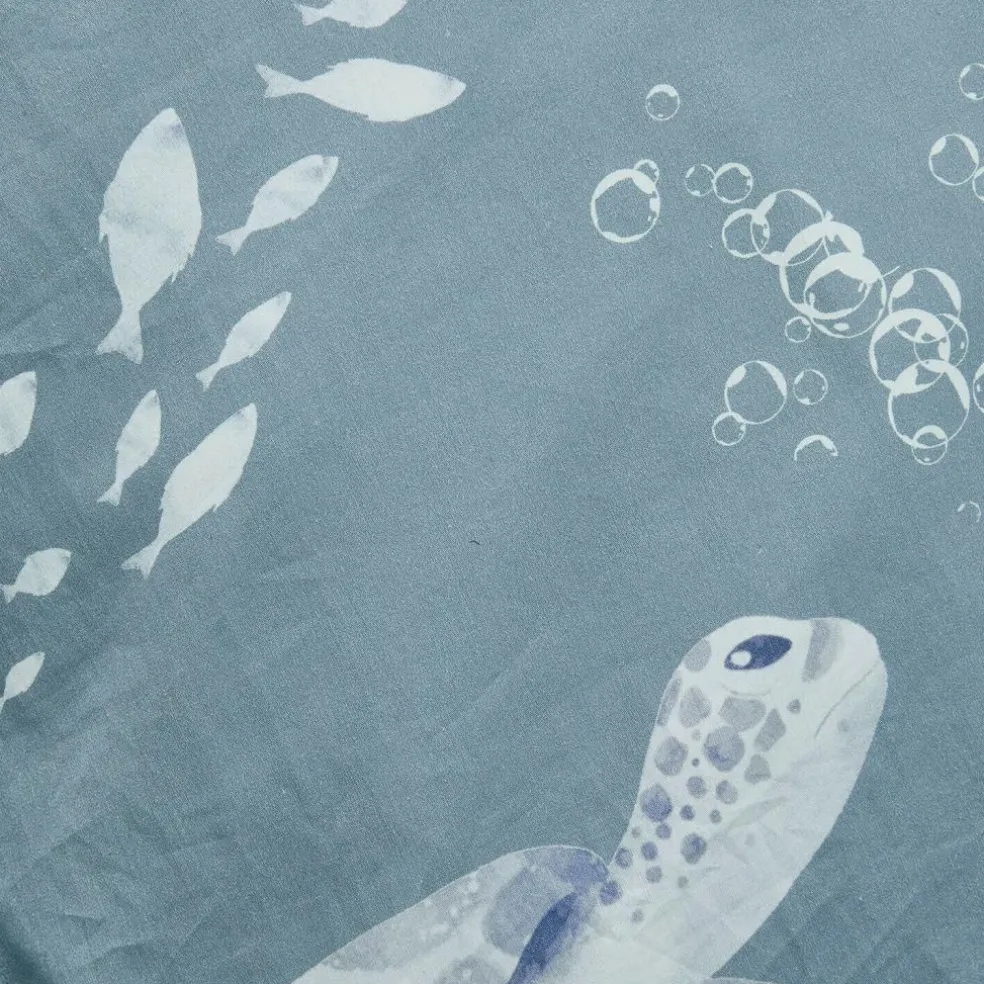 Wie ein sanftes Meeresrauschen wirkt diese Bettwäsche mit ihren träumerischen Schildkrötenmotiven. Die Unterwasserbewohner gleiten in zarten Weiß- und Grautönen über einen ruhigen, blauen Grund, begleitet von kleinen Blasen und Fischschwärmen – ein liebevoll gestalteter Print, der die Fantasie anregt und kleine Meerfreunde sanft in den Schlaf begleitet. Die reine Baumwolle fühlt sich angenehm glatt an und sorgt für ein ausgeglichenes Schlafklima. Dank der praktischen Bänder am unteren Ende lässt sich die Decke sicher fixieren – eine charmante Kombination aus Funktion und Design, die sowohl Kinder als auch Eltern begeistert.