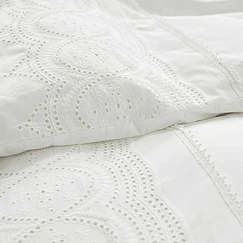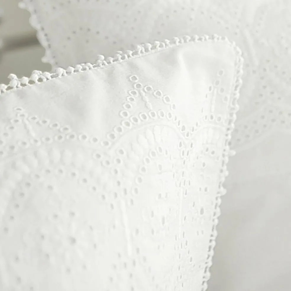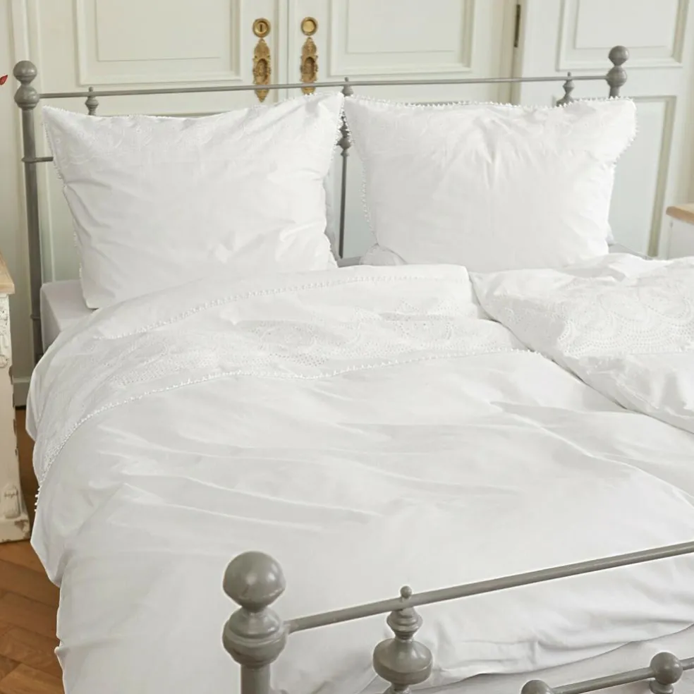 Ein romantischer Traum in Weiß! Mit ihrer üppigen Lochstickerei-Bordüre und dem reizvollen Spitzenabschluss erinnert die Bettwäsche an vergangene Zeiten, als man in den Schlafräumen nobler Landhäuser ganz selbstverständlich in edler, blütenweißer Wäsche ruhte. Was damals Tradition war, wird uns heute von Farbpsychologen bestätigt: Weiß im Schlafraum wirkt entspannend und erleichtert das mühelose Hinübergleiten in die Traumwelt. Und wenn vor dem Einschlafen Ihre Augen auf der nostalgischen Stickerei geruht haben, wird Ihnen vielleicht manche Nacht mit romantischen Träumen versüßt. Wie damals die Bettwäsche stets sorgfältig aus hochwertigen Materialien gearbeitet war, so ist das auch bei dieser Bettwäsche der Fall. Die weiche, atmungsaktive Baumwolle schmeichelt der Haut beim Hineinkuscheln, sorgt für ein angenehmes Klima und einen erholsamen Schlaf – im Sommer wie im Winter. Kopfkissen und Bettbezug werden stilecht mit nostalgischen Bindebändern geschlossen.