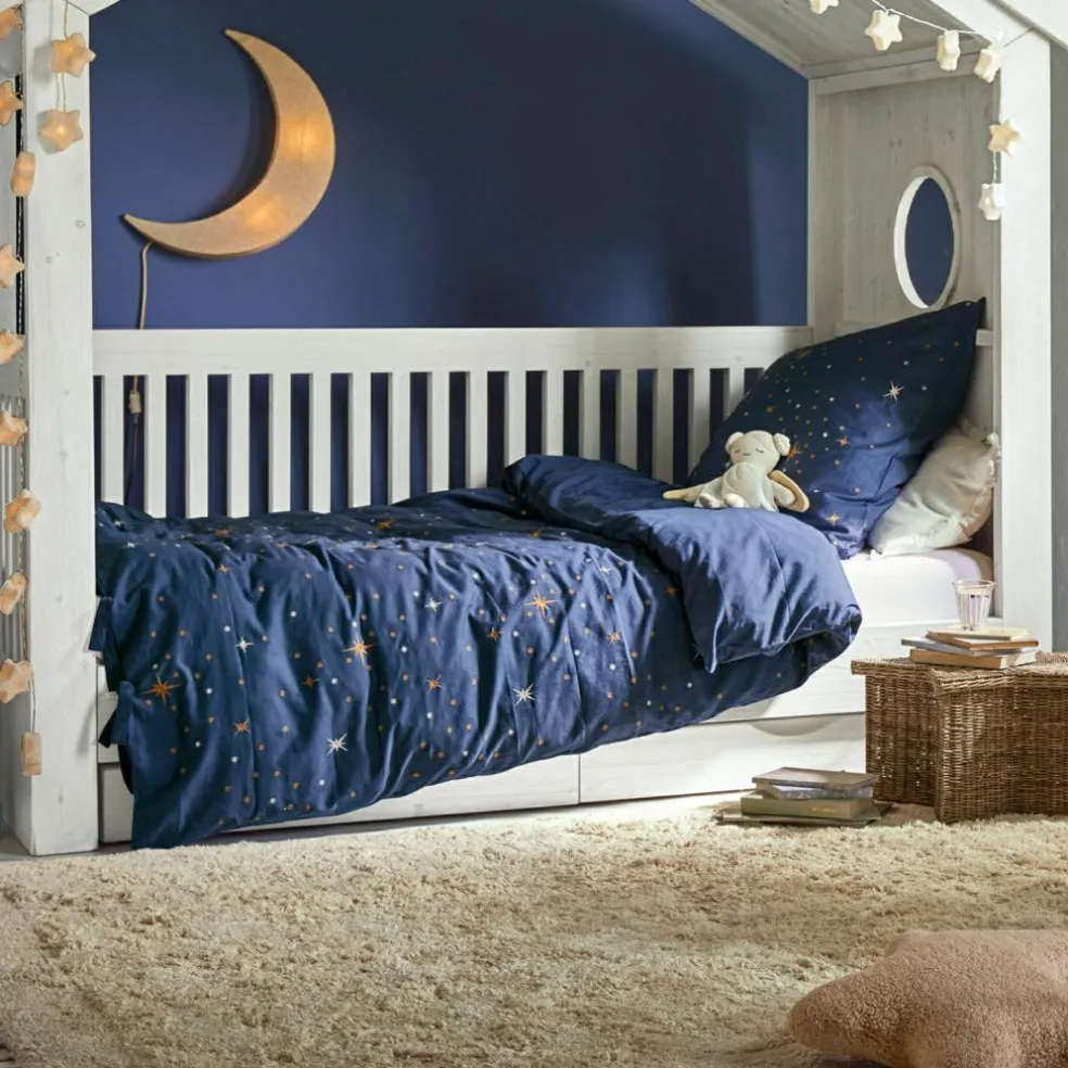 Wenn das Einschlafen zur Reise durch den Kosmos wird: Diese Kinderbettwäsche lässt kleine Abenteurer zwischen Sternen schlafen. Auf dem tiefblauen Baumwollstoff leuchten fein gestickte Sterne in Gold und Silber – wie ein Hauch von Sternenstaub. Jeder Stich erzählt von fernen Galaxien, von Wunschsternen und stillen Träumen. Die Bindebänder an der Seite ersetzen klassische Verschlüsse und unterstreichen die kindlich-verspielte Anmutung. Ein Textil, das Wärme schenkt, Geborgenheit bringt und dabei ganz ohne Kitsch auskommt – himmlisch schön für jedes Kinderzimmer.