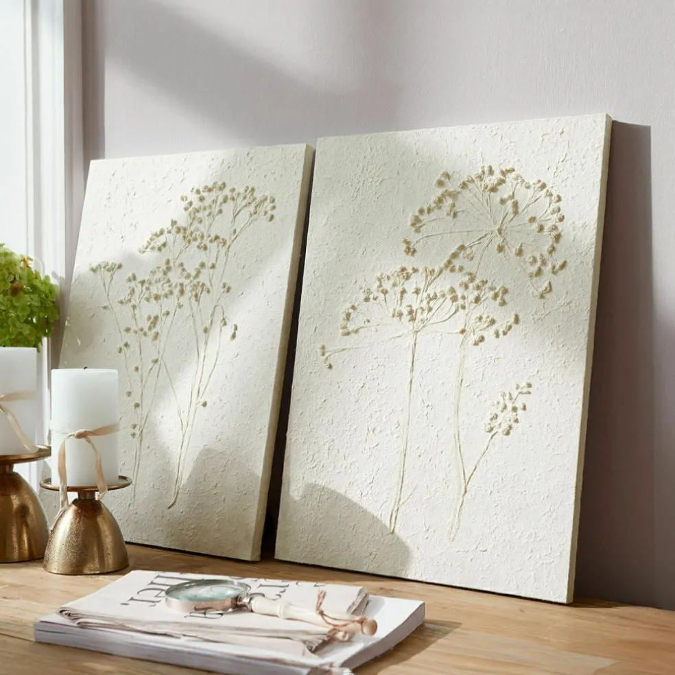 Das 2er Set dieser kunstvollen Wandbilder bringt Natur und Kunst in perfekter Harmonie zusammen. Die Basis besteht aus hochwertiger Baumwolle, deren Fasern mit einer schlichten weißen Farbe überzogen sind, was den Bildern eine dezente und zeitlose Eleganz verleiht. In die Struktur sind echte Trockenblumen eingefügt, die sorgfältig und liebevoll arrangiert wurden, um ein organisches und gleichzeitig ästhetisches Bild zu schaffen. Jedes Bild wird auf einem stabilen Holzrahmen präsentiert, der nicht nur für eine lange Lebensdauer sorgt, sondern auch eine einfache und sichere Anbringung ermöglicht. Diese einzigartigen Kunstwerke verleihen Ihrem Zuhause eine ruhige und natürliche Atmosphäre, die durch ihre Schlichtheit besticht und dennoch jeden Raum aufwertet.