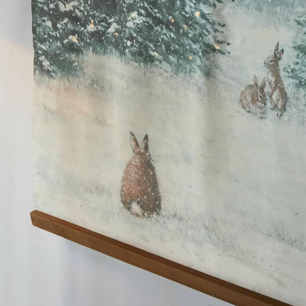 Erleben Sie die Magie des Winters mit diesem atemberaubenden LED-Bild, das eine friedliche Schneelandschaft mit einem prächtig beleuchteten Weihnachtsbaum und niedlichen Hasen darstellt. Der sorgfältig bedruckte Stoff fängt die Details und die Schönheit der winterlichen Szene perfekt ein. Die batteriebetriebenen LED-Lichterketten auf der Rückseite des Bildes erwecken den Baum zum Leben und sorgen für eine festliche Atmosphäre, die jedes Zuhause erstrahlen lässt. Eingefasst in einen eleganten Tannenholz-Rahmen, oben und unten, bringt dieses Bild einen Hauch von Natur und Tradition in Ihre Weihnachtsdekoration. Lassen Sie sich von der warmen, behaglichen Stimmung verzaubern und schaffen Sie eine besondere Festtagsstimmung in Ihrem Zuhause. Vielleicht bietet Ihnen das Motiv eines beleuchteten, schneebedeckten Tannenbaumes auch einen platzsparenden Ersatz für Ihren Weihnachtsbaum.