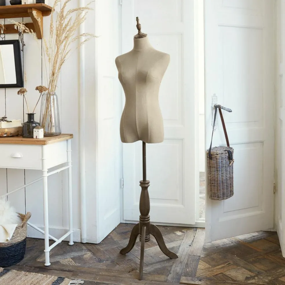 Ein wahres Schmuckstück mit nostalgischem Charme. Die edle Büste erinnert an eine Schneiderstube oder ein Modeatelier aus früheren Zeiten. Holen Sie sich wundervolles Vintage-Flair nach Hause und zieren Sie jeden Raum mit der hohen, schlanken Büste. Sie ist mit feinem, reinem Leinen bezogen und an einer Eisentange, sowie einem edlen Kiefernholzfuß befestigt. Das elegante Accessoire steht stabil und punktet mit einer formschönen Eleganz. Nutzen Sie die Büste pur als Dekoration oder drapieren Sie vielleicht Tücher und Halsketten daran. Auch das Outfit für den nächsten Tag lässt sich an diesem Schmuckstück bereits hübsch präsentieren. Wer selbst kreativ werden möchte, kann es natürlich auch als Grundlage für eigene Designs nutzen und die Schneiderbüste – wie urspünglich mal vorgesehen – auch als eine solche nutzen. In jedem Fall kommt mit diesem hochwertigen und zeitlosen Design eine kreative und künstlerische Note in jedes Ambiente.