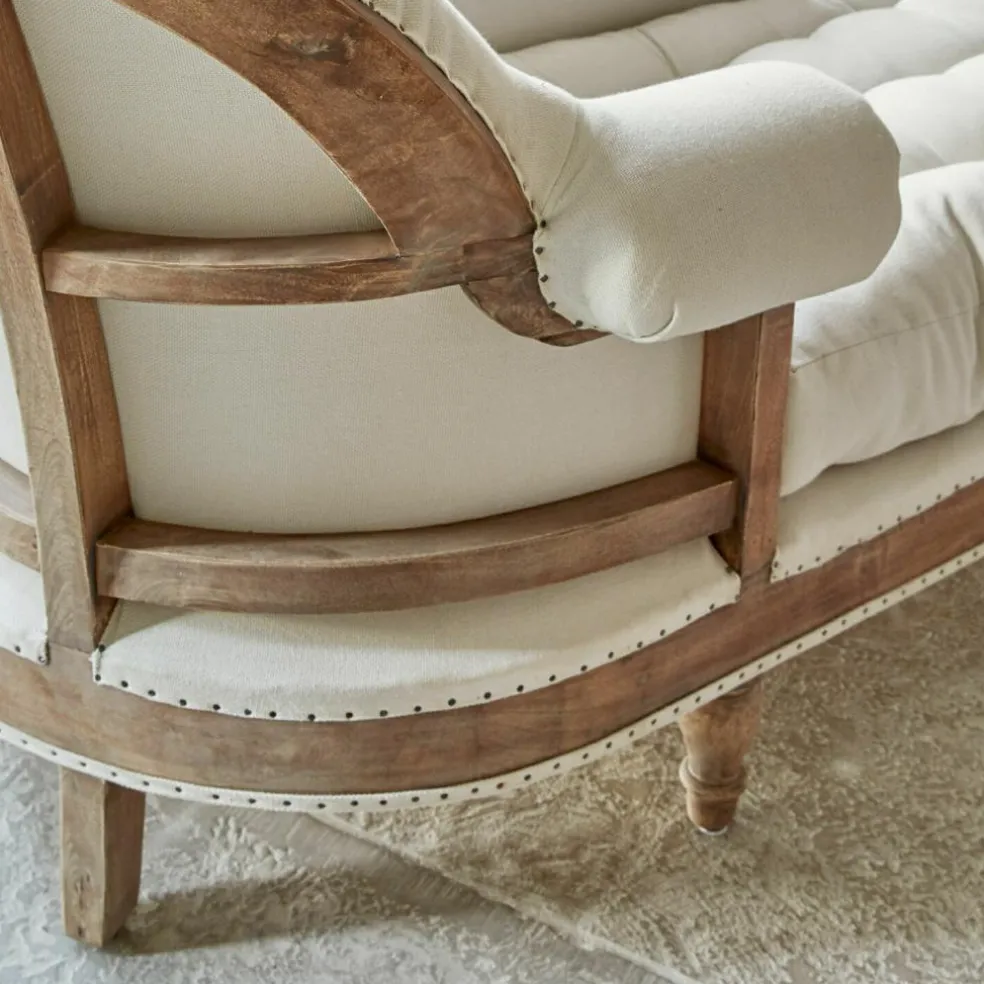 Schon beim Betreten des Raumes ist die Kombination aus eleganter Linienführung und edel schimmerndem Holz ein ästhetischer Genuss, während das luxuriös gepolsterte Kissen ein Gefühl wohliger Vorfreude auslöst, weil Sie sich gleich auf diese Entspannungsinsel sinken lassen und die kostbaren Freizeitstunden genießen können. Von den sanft gerundeten Rücken- und Armlehnen bis zu dem Kissen wird Sie die Chaiselongue nach Strich und Faden verwöhnen. Das großzügige Sitz-/Liegekissen ist mit einer stabilen, hochwertigen Polyesterfüllung versehen und in klassischer Chesterfield-Manier abgesteppt, das Gestell aus edlem Mangoholz wurde von Hand gefertigt und die feinen Details, wie liebevoll gedrechselte Beine und die umlaufende Nietenverarbeitung, zeugen von der Passion des Künstlers für das traditionelle Möbel- und Polsterhandwerk. Als Bezugsstoff für die Chaiselongue wurde reine Baumwolle gewählt, die mit einer Haptik im Leinen-Charakter verwöhnt, während sie mit dem hellen Naturton einen markanten Kontrast zu dem dunklen Holz setzt. Zusammen mit einer Kuscheldecke für kühle Abende und einem Beistelltisch für Getränk, Buch und Co bildet die Chaiselongue einen exklusiven Ruhepol, der Ihre Mußestunden – und Ihr Ambiente – krönen wird.