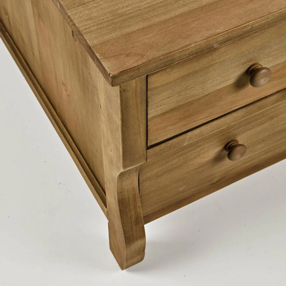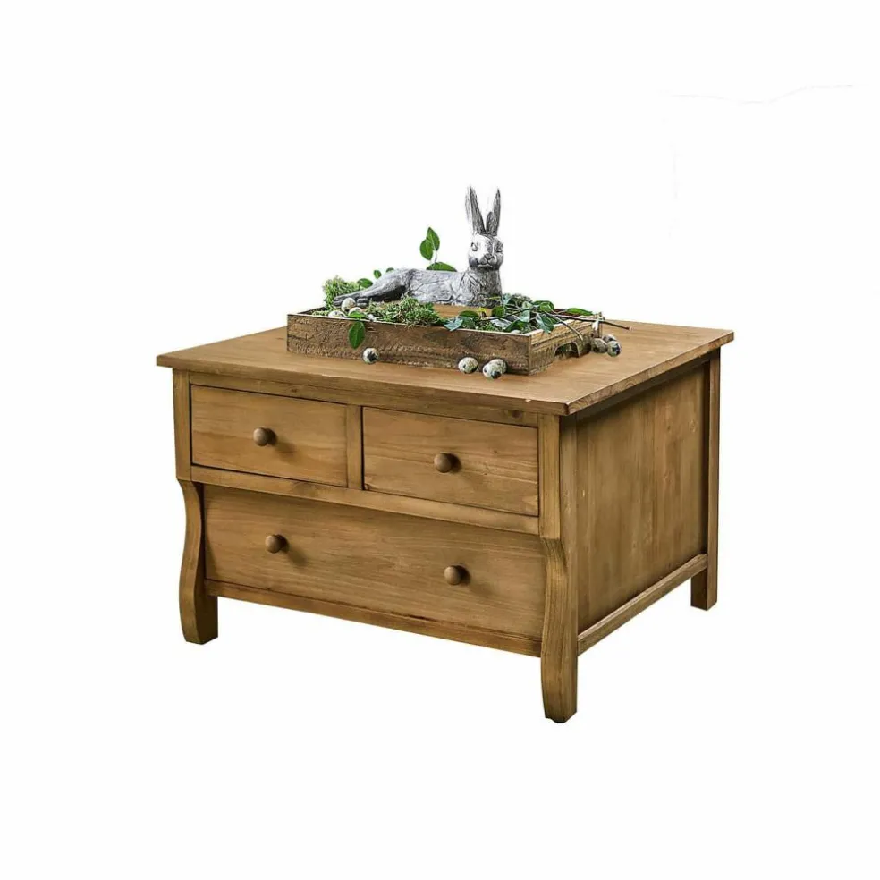 Ein außergewöhnlicher Couchtisch, der nostalgisch inspiriert ist und gleichzeitig als Kommode fungiert. Denn er bietet Raum für drei große Schubfächer, in denen sich einiges verstauen lässt. Die Seiten sind in Kassetten-Manier von Holzleisten gerahmt, während die schön geschwungenen Holzbeine einen festen Stand garantieren. Für den Shabby-Chic darf das antike Oberflächen-Finish nicht fehlen – gerade die unvollendete Schönheit mit authentischen Abnutzungsspuren macht diesen Tisch im ländlichen Stil so besonders. Die Qualität der handwerklichen Arbeit und der Korpus aus massivem Kiefernholz garantieren eine hohe Stabilität und Langlebigkeit. So werden Sie lange Freude an diesem einzigartigen Möbelstück haben.