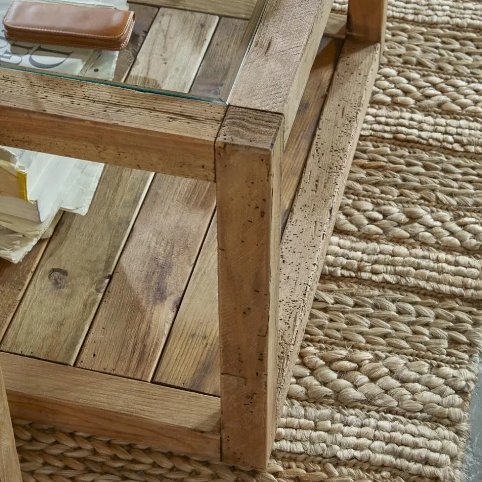 Eins, zwei, drei Tische – Sie haben die Wahl. Denn hinter diesem Couchtisch verbirgt sich ein geniales Modulsystem: drei Bausteine, die sich individuell und flexibel kombinieren lassen, wie es die Situation gerade erfordert. Im Zentrum befindet sich ein rechteckiger Tisch, der klassisch vor oder neben dem Sofa stehen kann und Getränke, Kerzen oder was Sie sonst gerne in der Nähe haben, bereithält. Die beiden halbrunden Tischteile erweitern den eckigen zu einem größeren ovalen Tisch, falls mehr Gäste bequemen Zugang zum Couchtisch haben sollen. Manche Abende verbringen Sie am liebsten in Ihrem gemütlichen Lesesessel und hätten auch dort gerne eine kleine Ablagefläche? Bitte sehr, dann holen Sie sich eins der halbrunden Elemente und genießen den Feierabend. Oder schieben Sie die beiden halbrunden Tischelemente zu einem kleinen runden Tisch zusammen. Im Gästezimmer fehlt eine Ablagefläche neben dem Bett? Bitte sehr, der Couchtisch wird sich gerne kurzfristig von einem seiner Elemente trennen. Genial, nicht wahr? Und dazu kommt die meisterliche Ausführung in wiederaufbereitetem Kiefernholz. Denn dieses Naturmaterial ist nicht nur nachhaltig, sondern kann sich sogar im Schmuck einer besonders charaktervollen Maserung präsentieren. Die bei jedem Tisch anders ausfällt und deshalb jeden Couchtisch zu einem Unikat macht. Bei allen drei Tischmodulen besteht die Ablagefläche aus Klarglas.