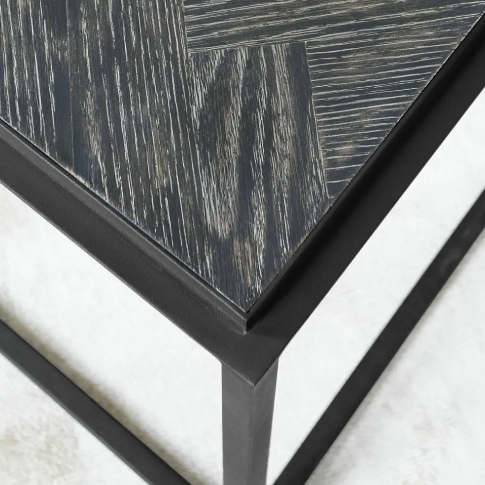 Erleben Sie die perfekte Symbiose von Industrial-Design und rustikalem Charme mit diesem exquisiten Couchtisch. Die robuste Eisenkonstruktion sorgt für langanhaltende Stabilität und verleiht Ihrem Raum einen modernen, urbanen Touch. Die Tischplatte aus hochwertigem Eichenholz beeindruckt mit einem kunstvollen Fischgrätmuster, das nicht nur visuell begeistert, sondern auch die natürliche Schönheit der Holzmaserung zur Geltung bringt. Ob als Mittelpunkt in Ihrem Wohnzimmer oder als praktisches Möbelstück in Ihrem Büro – dieser Couchtisch ist eine harmonische Ergänzung für jedes Interieur.