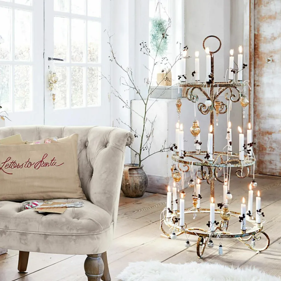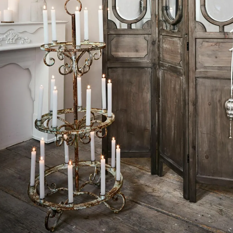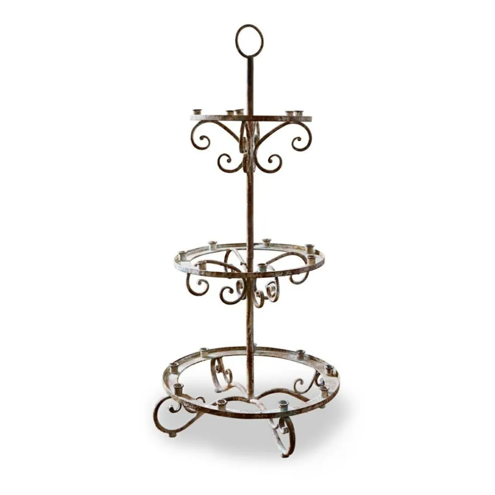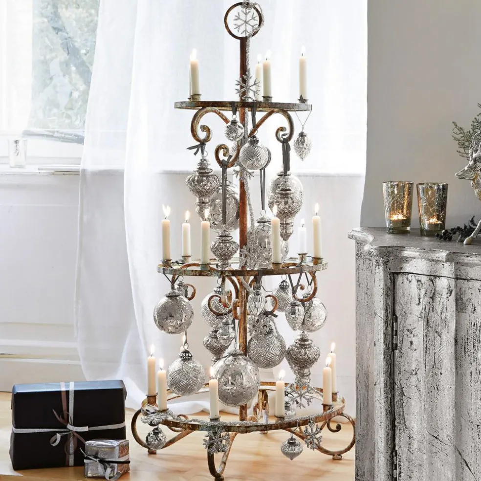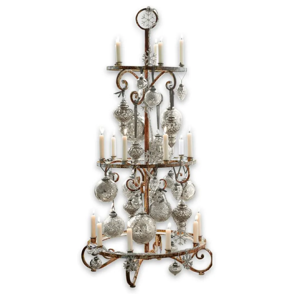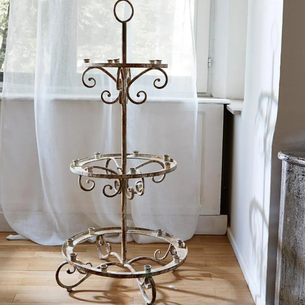 Ein Tannenbaum ist Ihnen etwas zu pflegeintensiv? Dann ist dieser festliche Deko-Baum aus Eisen die perfekte Alternative. Das formschöne Stück überzeugt mit edler Optik und einem Antik-Finish, welches stilvoll an vergangene Zeiten erinnert. Romantische Schnörkel und charmante Patina tragen dazu bei. Auf drei Ebenen befinden sich kreisförmig angerichtet Kerzenhalter, und dank des Tragegriffes lässt er sich ganz leicht umstellen. Schmücken Sie diese schöne Weihnachtsbaum-Alternative mit duftendem Wintergrün, Samtschleifen und Weihnachtsschmuck. Ihrer Phantasie sind dabei keine Grenzen gesetzt, und vielerlei Weihnachtsanhänger lassen sich hier ganz einfach befestigen. Wenn Sie dann die Kerzen entzünden, werden Sie eine echte Tanne gar nicht mehr vermissen. Tannennadeln auf dem Boden und ein welkender Weihnachtsbaum sind mit diesem Deko-Baum jedenfalls kein Thema mehr an den Festtagen. Natürlich können Sie ihn aber auch ergänzend zur Weihnachtstanne aus dem Wald als stilsicheres Highlight in der Festzeit nutzen. Tipp: Auch nach den Festtagen lässt der eiserne Deko-Baum sich noch wunderbar ganz pur als romantischer Kerzenhalter nutzen oder auch saisonal dekorieren.