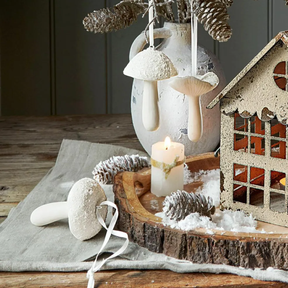 Ein Hauch Waldromantik trifft auf winterlichen Zauber: Diese drei Porzellanpilze erinnern mit ihrer schlichten Form an kleine Waldwunder, die in einer frostigen Winternacht entdeckt wurden. Die Oberfläche der Hüte ist von feinem Glitzer überzogen – als hätte sich stiller Raureif auf ihnen niedergelassen. Durch das seidige Aufhängeband lassen sich die kleinen Kunstwerke überall inszenieren: hängend am Tannenstrauß, als verspielter Baumschmuck oder liebevoll am Geschenkband gebunden. Ihr matter Schimmer harmoniert wunderbar mit Naturmaterialien, Glas und Metall – ideal für alle, die es dezent magisch lieben.