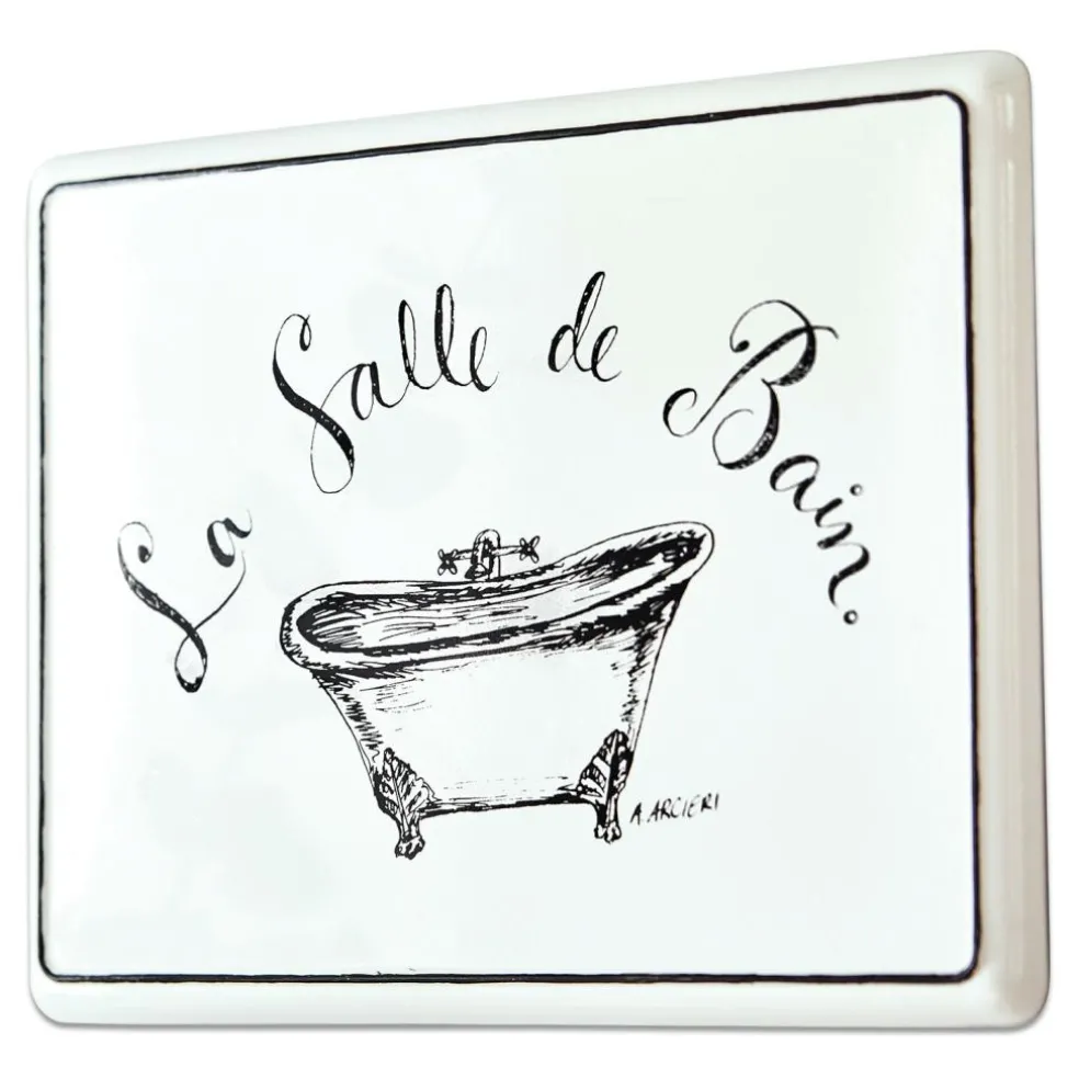 La Salle de Bain – übersetzt heißt das Badezimmer. Und genau so charmant wie Badezimmer auf französisch klingt, sieht auch dieses zauberhafte Schildchen aus. Gefertigt wurde es aus Eisen. Eine Badewanne und der schnörkelige Schriftzug weisen auf äußerst pittoreske Weise darauf hin, in welchem Zimmer man sich befindet – oder welches Zimmer man betritt. Denn ob man das hübsche Accessoire an der Wand befestigt oder an der Badezimmertür, ist Geschmacksache. Für die Wandbefestigung befinden sich auf der Rückseite hilfreiche Vorrichtungen. So kann das Objekt problemlos an zwei Nägel gehängt werden. Wer mag, kann es auch auf der Schmink-Konsole oder auf einer Kommode platzieren. Das Design macht es zu einem wunderschönen Piece für Liebhaber von romantischem Ambiente. Zum Landhaus-Stil, zu Wohnen mit Einflüssen aus der Provence oder Paris oder auch zum zauberhaften Shabby-Chic macht es sich schlichtweg formidable – wunderbar. Kombiniert mit weiteren Accessoires mit nostalgisch-verträumten Charme, entsteht ein wunderschönes Ambiente.