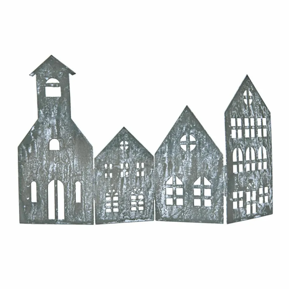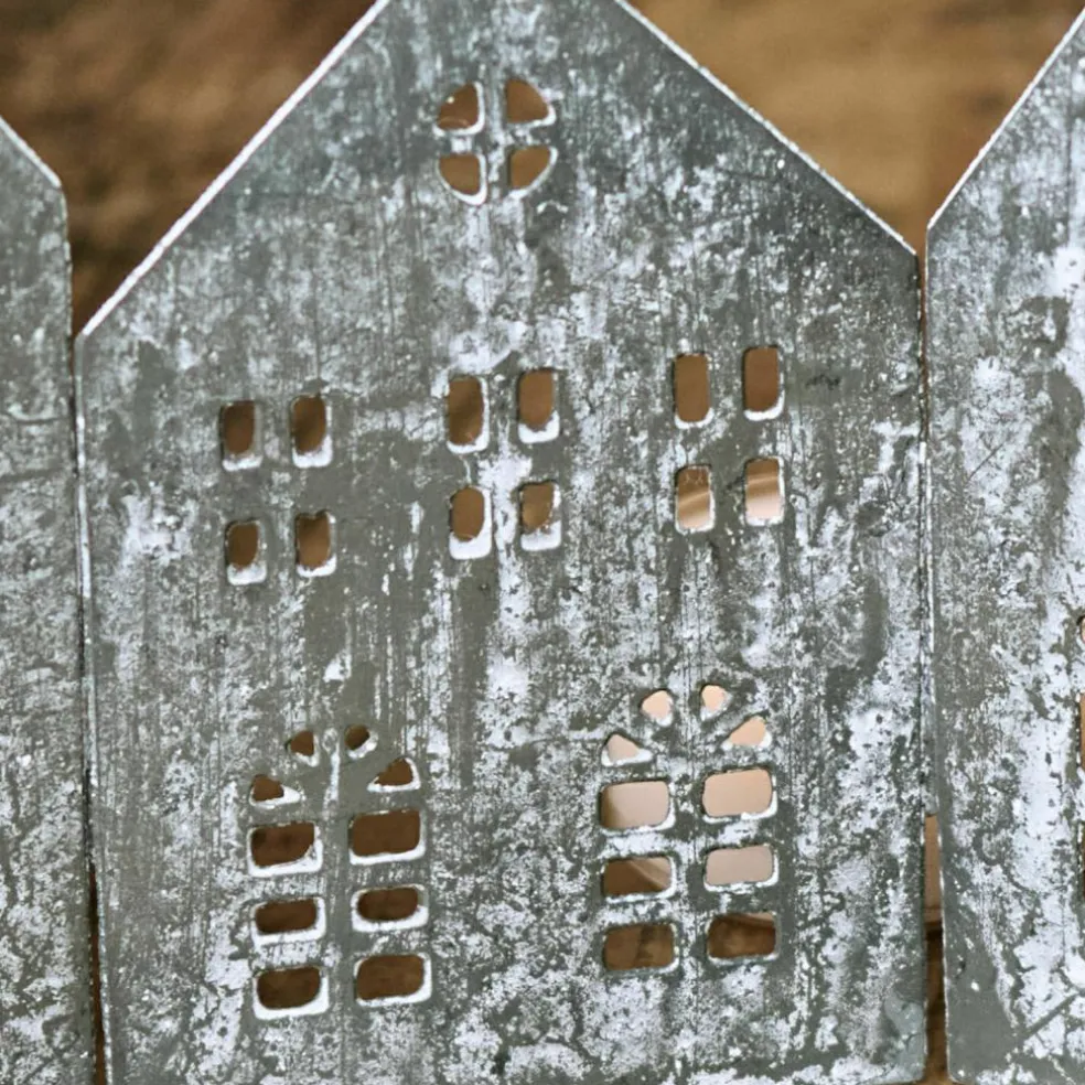 Wie aus einem alten Märchenbuch entflohen, erzählt dieser Deko-Shutter von verschneiten Gassen, flackernden Lichtern hinter Fenstern und dem Zauber vergangener Winter. Die vier stilisierten Häuserformen – darunter auch ein charmantes Türmchen – sind aus Eisen gefertigt und durch Faltungen verbunden, sodass sie leicht aufgestellt und arrangiert werden können. Ihr Antikgrau-Finish wirkt wie verwittert, mit absichtlich eingearbeiteten Unregelmäßigkeiten, die den Eindruck gelebter Geschichte erzeugen. Ob auf dem Fensterbrett, Sideboard oder Kaminsims – besonders in Kombination mit warmem Kerzenschein entsteht eine Szenerie, die Gemütlichkeit und eine Prise Melancholie versprüht.