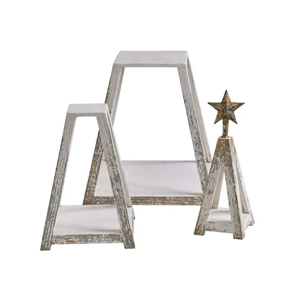 Er erinnert an einen stilisierten Weihnachtsbaum und ist dabei doch so viel mehr: Dieses markante Dekostück vereint rustikales Tannenholz mit einem Antikweiß-Finish, das an verwitterte Landhausmöbel erinnert. Die drei offenen Etagen laden ein, eigene kleine Szenerien zu gestalten – vielleicht mit gläsernen Christbaumkugeln, Kerzenlichtern oder einem Hauch von Natur. Jede Etage wirkt wie eine kleine Bühne für Ihre Lieblingsstücke. Die charmant abgeschliffenen Kanten erzählen vom gelebten Stil vergangener Zeiten, während der goldfarbene Eisenstern an der Spitze einen festlichen Akzent setzt. Ein dekorativer Baum für alle, die das Besondere suchen – ob zur Weihnachtszeit oder als dauerhafte Deko mit kreativem Twist.