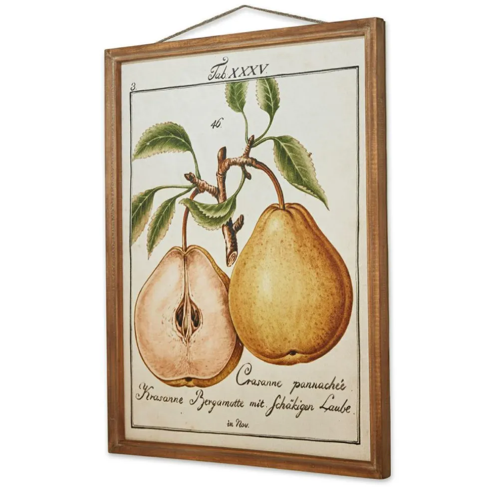 Holen Sie sich eine stilvolle Prise Nostalgie in Ihr Heim. Dieses wunderschöne Deko-Board bezaubert mit einem kunstvollen Druck, der an alte Botanik-Bücher erinnert. Nicht nur zum Shabby-Chic entsteht hiermit ein harmonisches Ambiente. Der klassische Print auf Stoff ist über eine Basis aus MDF gezogen, sodass das Board schön stabil ist. Der Rahmen besteht aus natürlichem Kiefernholz, die Aufhängung aus Eisen. So lässt sich das schicke Accessoire ganz einfach an der Wand aufhängen. Sie können es aber auch angelehnt aufstellen. Eine wahre Zierde für die Küche, welche hiermit Country-Flair erhält, und natürlich auch in Wohnräumen ein Highlight. Das detailreiche und zeitlose Birnen-Motiv bleibt sicherlich über viele Jahre ein attraktiver Anblick.