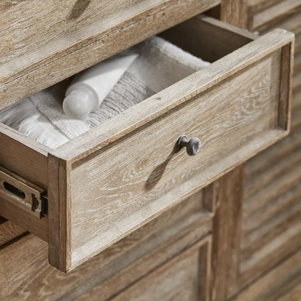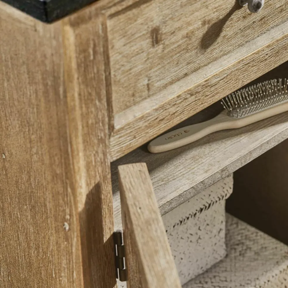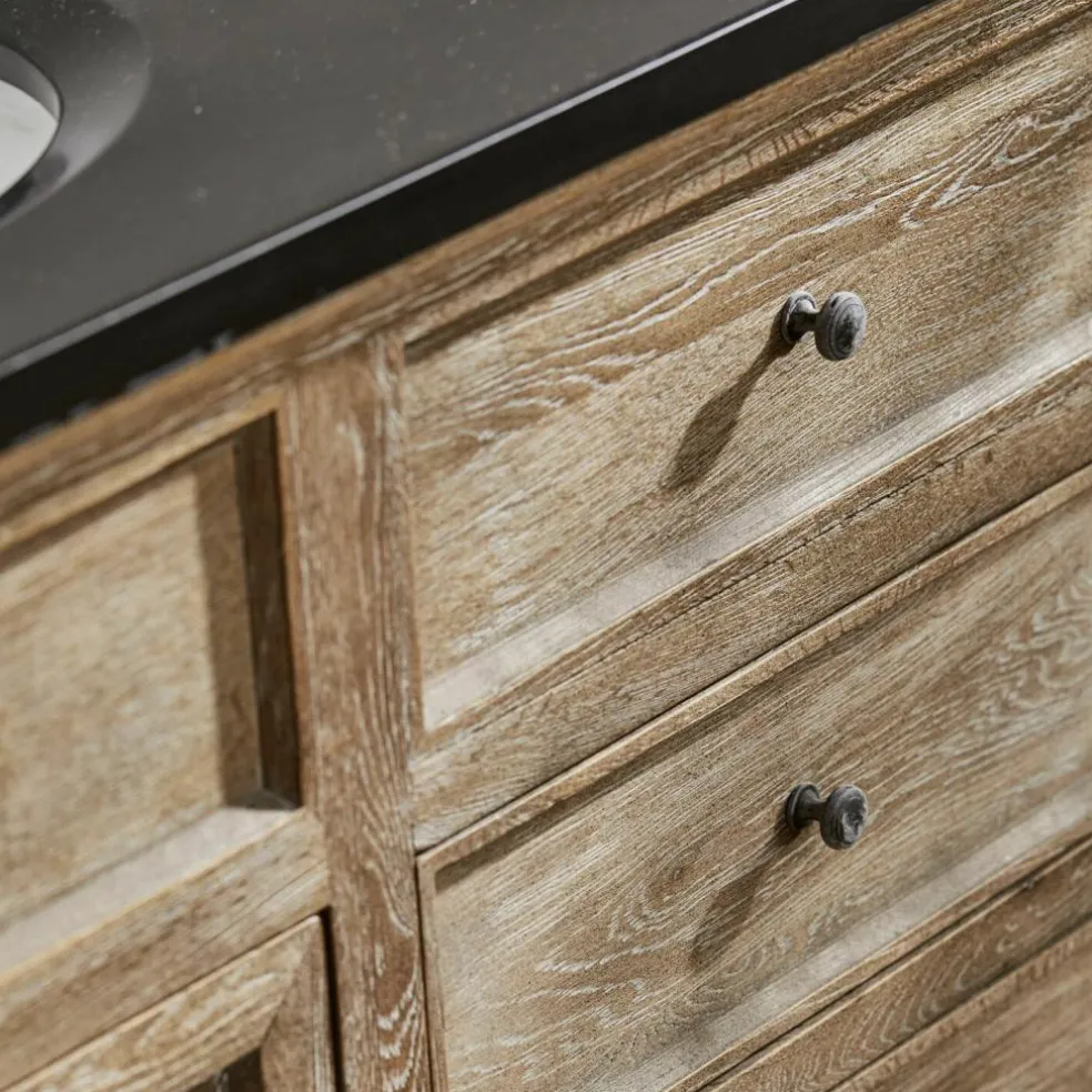Der Waschtisch besticht mit seiner eleganten Erscheinung, einer schwarzen Natursteinplatte und mit einem handbearbeiteten Korpus aus massivem Eichenholz. Für ausreichend Stauraum sorgen drei geräumige Schubladen und zwei Fächer mit Lamellentüren. Die oberen drei Schubladen bilden die optische Blende für die beiden Keramik-Waschbecken. Diese wurden in die Steinplatte eingelassen und heben sich in strahlendem Weiß vom Rest des Möbels ab.