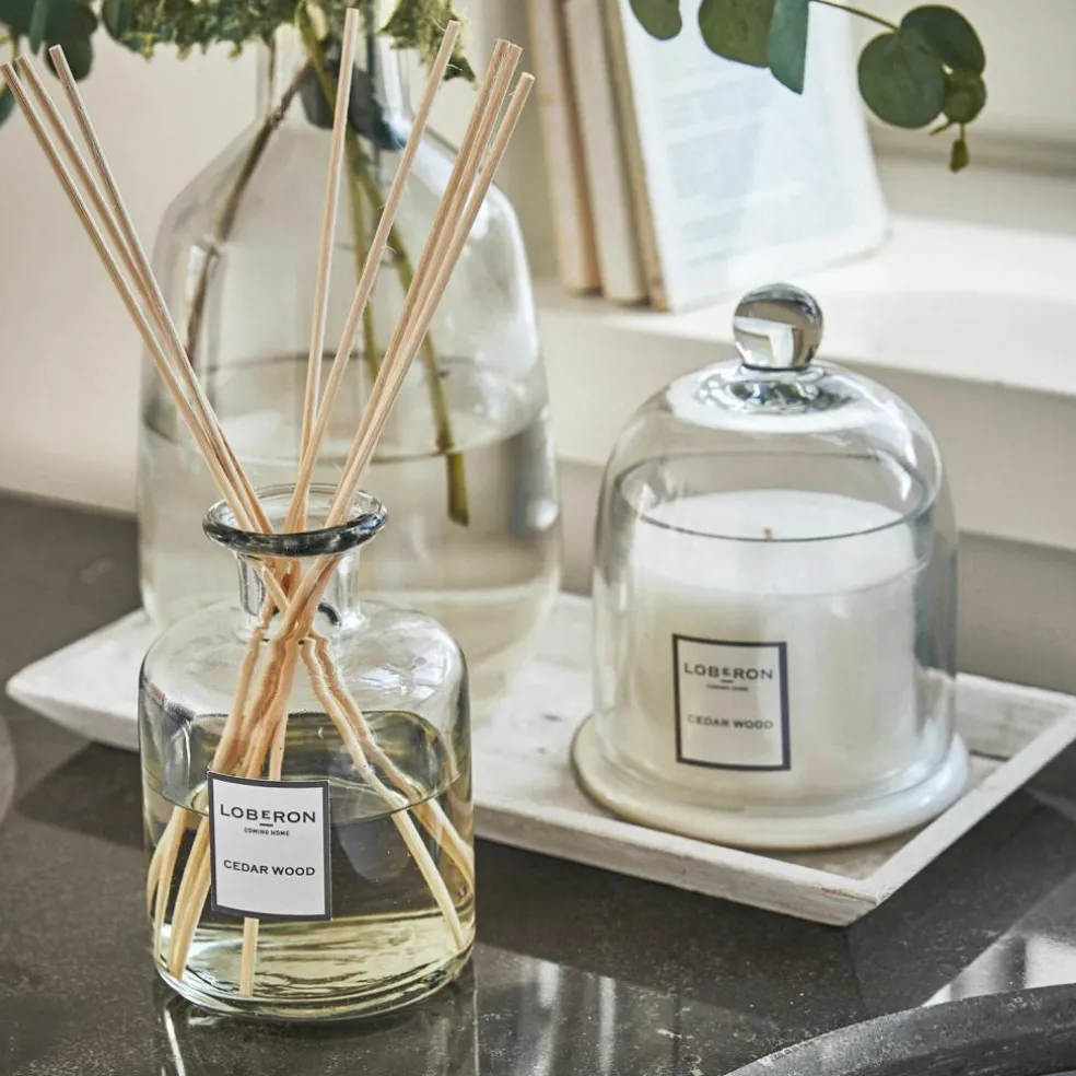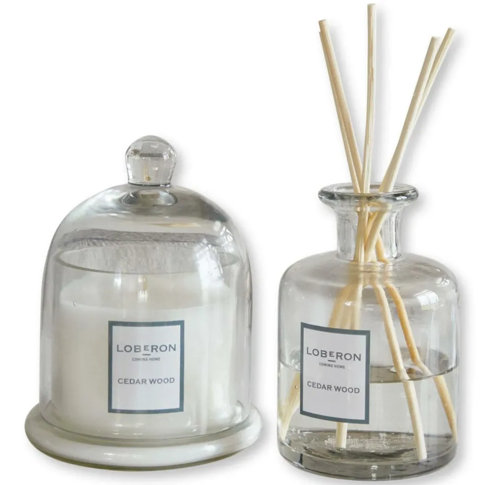 Ein traumhafter Duft und eine luxuriöse Dekoration in einem – dieses wertvolle Set ist perfekt für alle, die edle Düfte lieben. Erleben Sie eine stilvolle Duftkomposition, die jeden Raum in eine traumhafte Duftwelt entführt. Dabei spielen zwei Duftspender die Hauptrolle: Die stilvolle Duftkerze hat eine schmückende Glas-Cloche, der Raumduft mit Stäbchen ist in einem hübschen, gläsernen Behälter untergebracht. Der Flüssigduft wird in einem separaten Behälter geliefert und kann daher individuell portioniert werden. Alle Glasbehälter sind mundgeblasen und mit einem LOBERON-Print verziert. Ein tolles Set mit geschmackvollem Akzent und auch eine sehr gute Geschenkidee. Die hölzernen Duftstäbchen geben den Duft kontinuierlich und dosiert ab, während die Kerze für romantisches Licht und ein Dufterlebnis zugleich sorgt. Die perfekte Wahl für das Schlafzimmer, im Bad oder im Wohnzimmer und wirklich ein Erlebnis für alle Sinne. Derzeit gibt es unser Dufset in diesen himmlischen Duftrichtungen: Zedernholz, Oud, Ibiza und Hearth & Birch. Der Geruch von Zedernholz erklärt sich natürlich von selbst. Der Duft Oud eröffnet mit einem würzigen Zitrusakkord aus Kardamom und Bergamotte. Das Hauptthema ist ein holziger Komplex aus Agarholz, Zedernholz und Patschuli mit einem blumigen Lilienakkord. Die Basisnote besteht aus holzigem Amber mit einem süßen Benzoe-Vanille-Moschus-Charakter. Bei Hearth & Birch stehen Zitrusfrüchte und Kräuter im Vordergrund. Ein dezenter Holzrauch-Geruch mischt sich darunter und veredelt die Duftnote. Bei der Variante Ibiza erhalten Sie eine blumige, süße und leicht holzige Durftnote. Vermengt mit etwas Moschus und Kampfer ergibt sich so ein betörender Raumduft.
