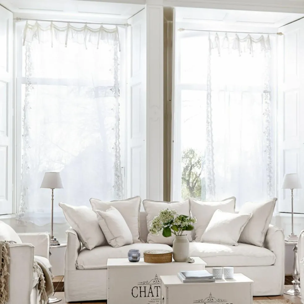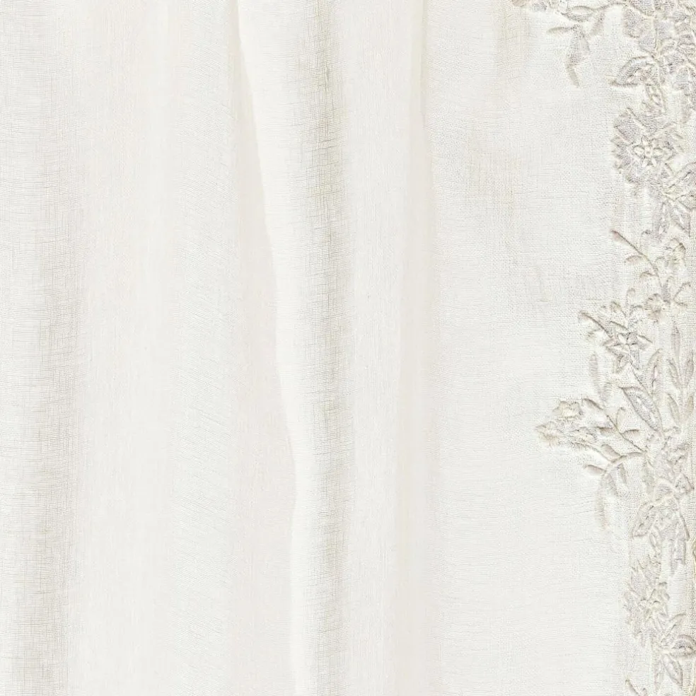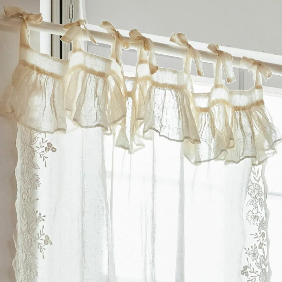 Sie wünschen sich einen luftig-leichten Hauch mit Vintage-Charme in Ihrem Heim? Dann treffen Sie mit dieser wertvollen Gardine eine gute Wahl. Sie besteht aus reinem Leinen und ist sehr zart und fein gewebt. Eine romantische Blumenstickerei und Spitze zieren sie – wie ein wertvolles Erbstück aus früheren Zeiten. Das transparente Batist-Gewebe lässt schön das Licht durchschimmern und hat einen sehr dekorativen Effekt. Die edle Gardine könnte im Wohnzimmer oder dem Home Office ein Plätzchen finden, wo nicht allzu viel Sichtschutz benötigt wird. Mit den charmanten Bindebändern ist die Anbringung ganz einfach, und die Höhe lässt sich auch ein wenig variieren. Nostalgie, die bezaubert.