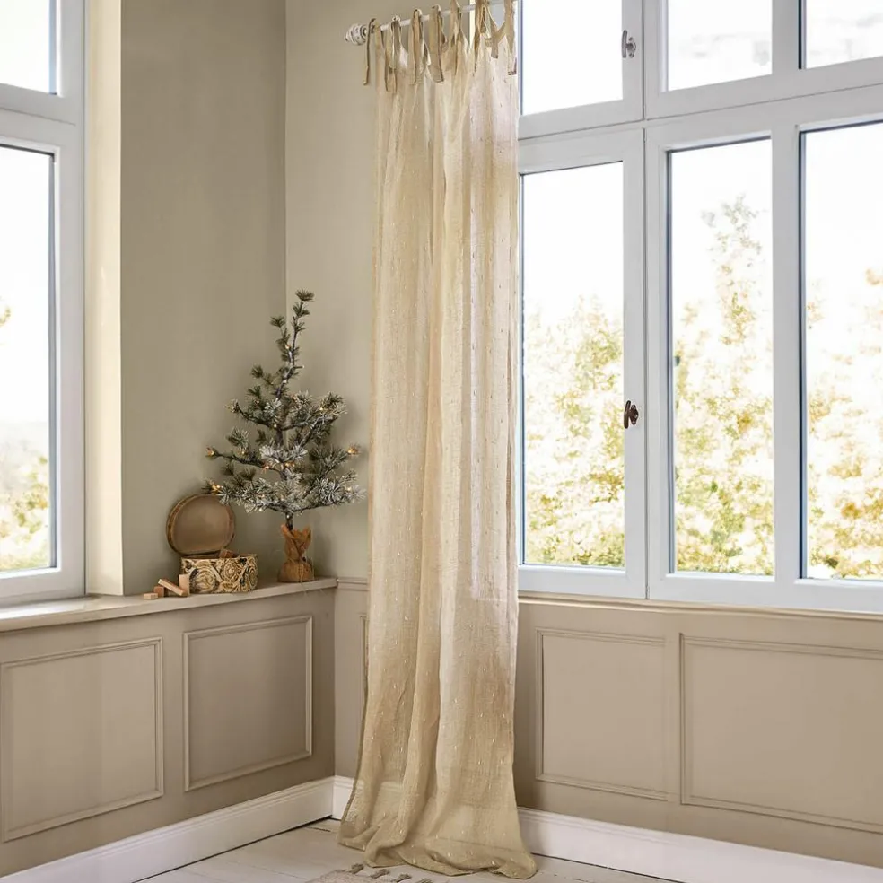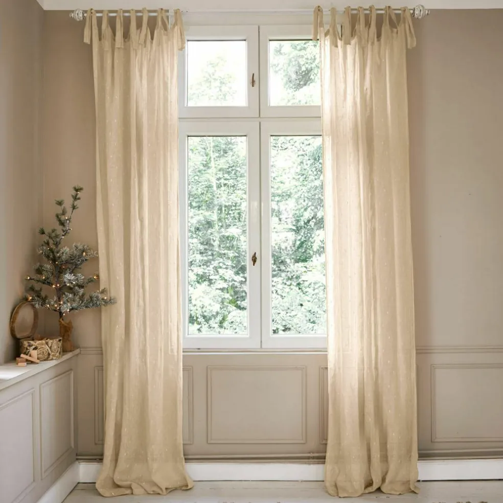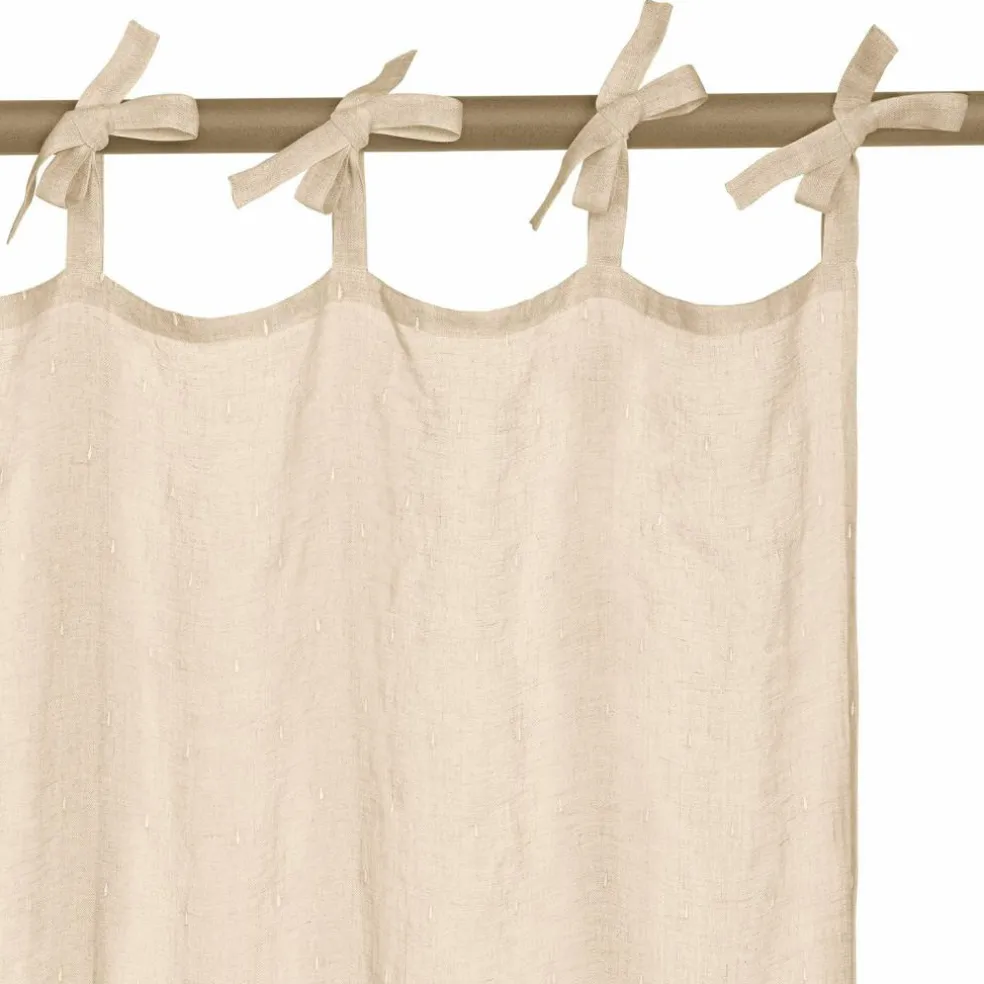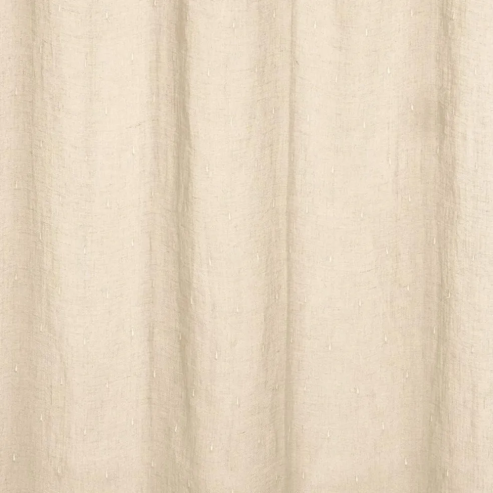 Ein Vorhang wie ein Sommerhauch – leicht, natürlich und voller Sanftmut. Das feine Leinen in natürlichem Ton schenkt dem Raum eine ruhige, warme Ausstrahlung, die ideal fürs Baby- oder Kinderzimmer ist. Liebevoll eingestickte Tropfenmuster tanzen wie kleine Regentropfen über die Fläche und sorgen für charmante Details, die bei jedem Lichteinfall zur Geltung kommen. Die Bindebänder verleihen dem Vorhang eine verspielte Note und machen das Anbringen kinderleicht. Ein Textil, das nicht nur Sichtschutz bietet, sondern auch Geborgenheit schafft.