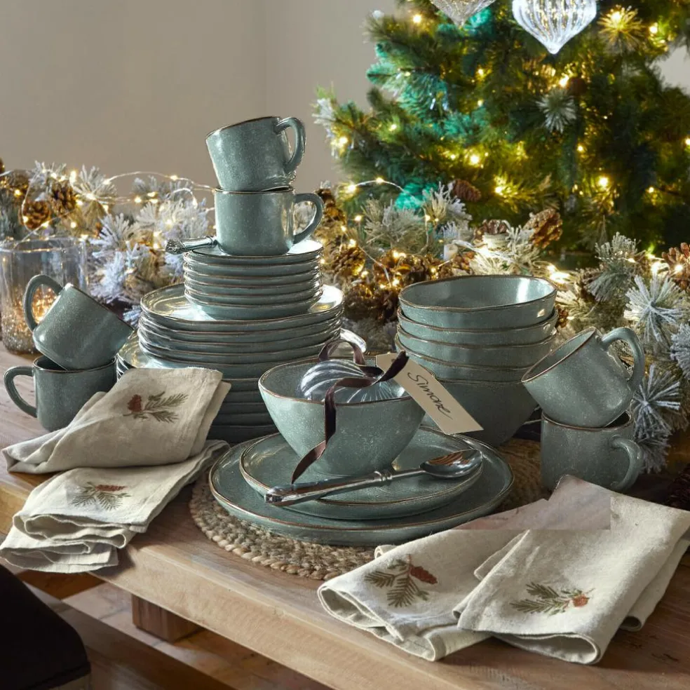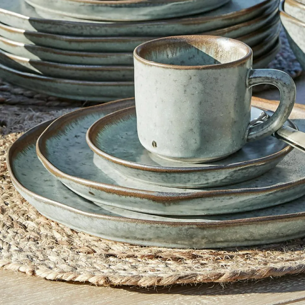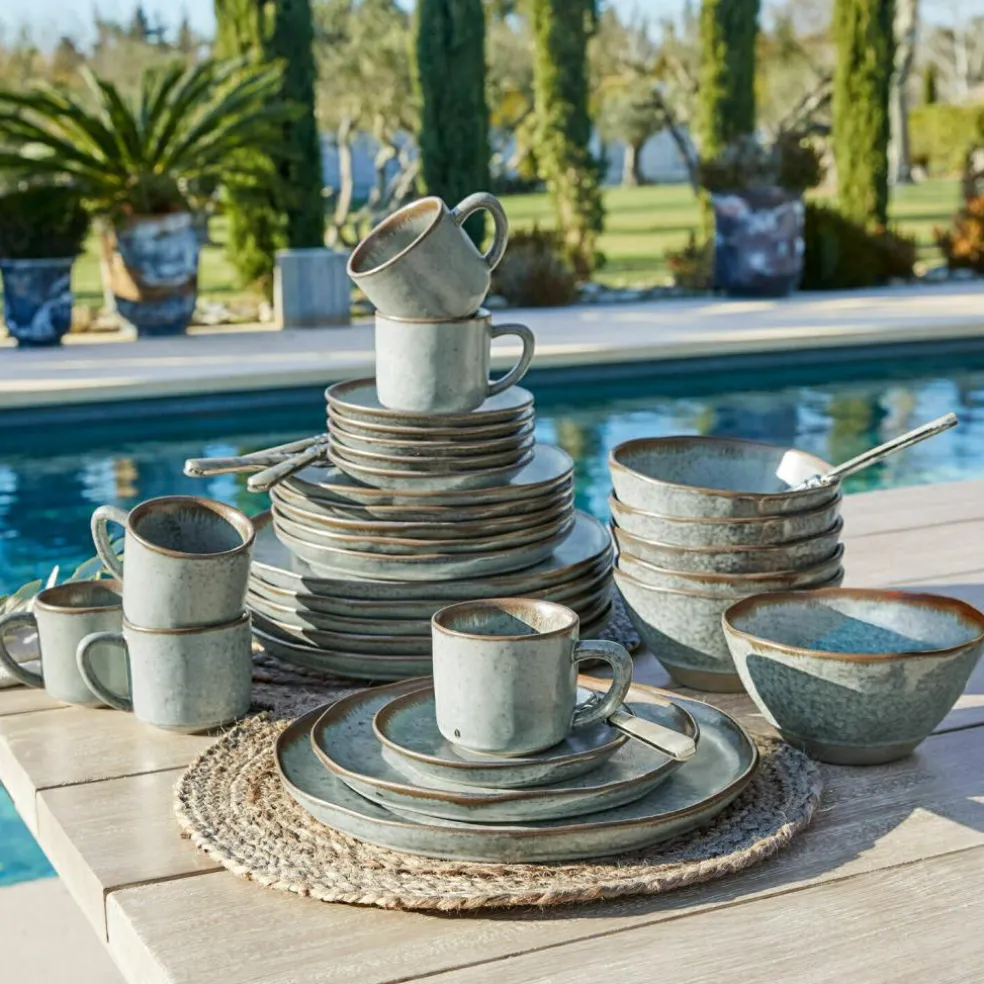 Ein reizendes, großes Set aus dreißig Teilen mit ganz ursprünglichem Charme. Das schicke Geschirr ist bewusst uneben designt, was ihm eine handgemachte Anmutung gibt. Es besteht aus Steinzeug mit handgetöpferter Optik. Der Boden ist bei allen Elementen unglasiert. Besonders bei den Schüsseln ist das sehr gut zu sehen. Diese unbearbeitete Seite macht das ganze Set noch reizvoller. Diese natürliche, mediterrane Note sorgt für Urlaubsgefühle. Hiermit ist Ihre Tafel immer perfekt passend und harmonisch eingedeckt. Das große Set ist ideal für Mahlzeiten mit Freunden und Familie in geselliger Runde. Enthalten sind sechs Abendessenteller, sechs Beilagenteller, sechs Tassen, sechs Unterteller und sechs Schüsseln. Vom Kaffee am Morgen bis zu Brunch und Frühstück, einem leichten Salat am Mittag, Obst und Käse als Snack, Kaffee und Kuchen am Nachmittag bis hin zum Dinner am Abend sind Sie hiermit bestens ausgestattet. Kleinere Sets dieses hochwertigen Geschirrs, wie zum Beispiel ein Set aus sechs Tellern oder ein Set aus sechs Tassen samt Untertassen, können Sie ebenfalls separat hier im Shop bestellen. Suchen Sie einfach nach unserer Biarré-Geschirrreihe. Wir wünschen guten Appetit.