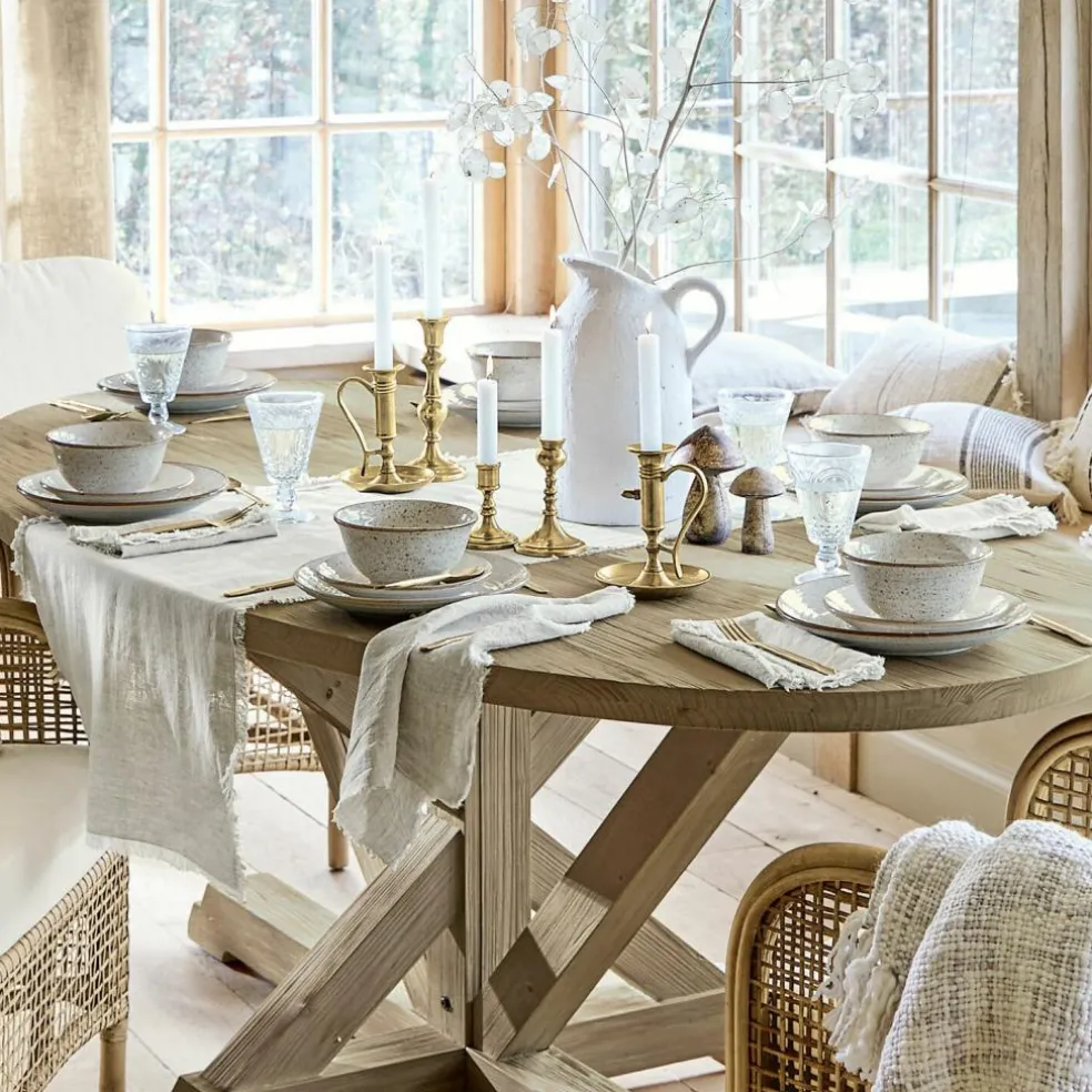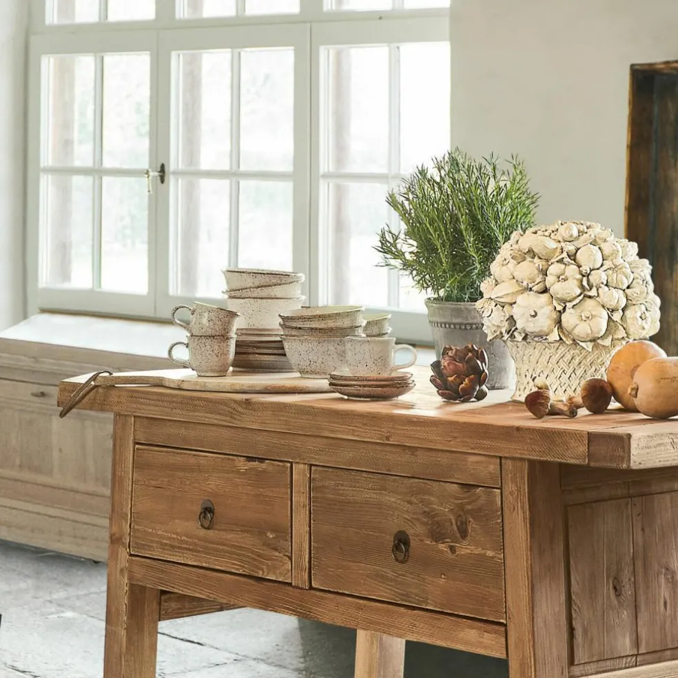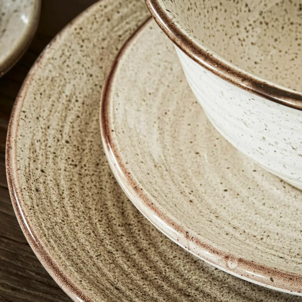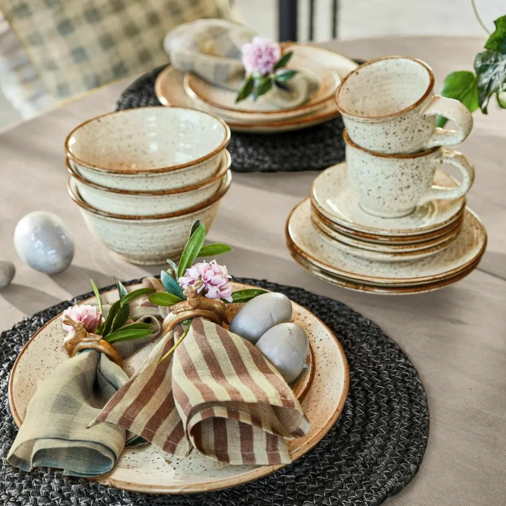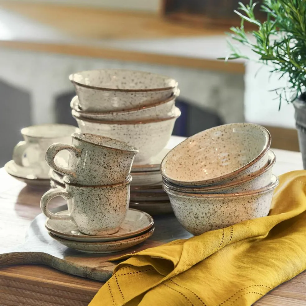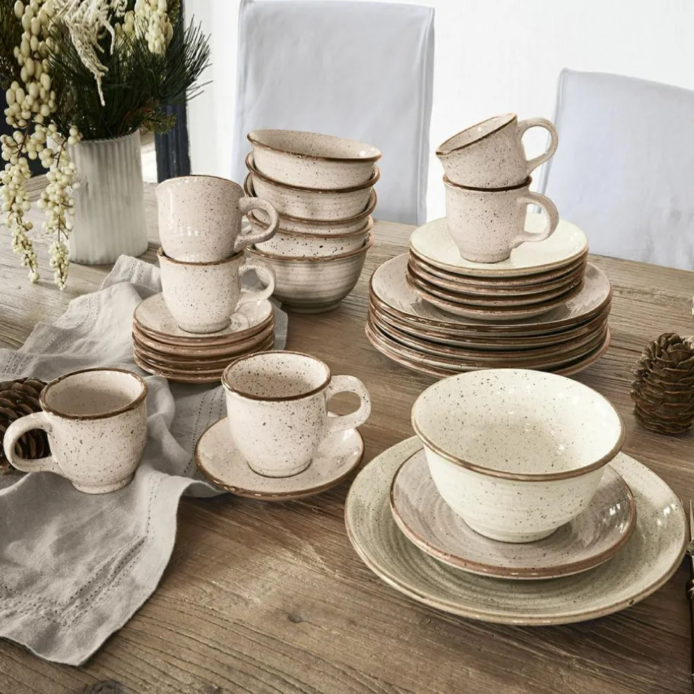 Wer schon einmal in der Toskana oder der Provence in einem kleinen Landgasthof eingekehrt ist, wird sich erinnern, wie dort die köstlichsten Speisen in rustikalem Steingut-Geschirr serviert wurden. Und wie gut dieses robuste Geschirr zu den rohen Holztischen und den edlen Leinenservietten passte. Und wie in der italienischen Trattoria die Pasta ganz selbstverständlich hausgemacht ist und in der französischen Auberge die Tarte zum Dessert frisch aus dem Ofen kommt, so ist auch das Steingut-Geschirr oft kunstfertig von Hand getöpfert, wie man an den kleinen Abweichungen von der Industrie-Norm erkennen kann. Die aber niemanden stören, sondern ihm erst den eigenen Charme verleihen. Auch dieses Geschirr 30er Set zeigt mit seinem bewussten unebenen Design den typischen Hand-made-Charakter und kommt besonders schön in einem stilvollen Landhaus-Ambiente zur Geltung. Das Geschirr 30er Set besteht aus hochwertigem Steingut und ist mit einer mikrowellengeeigneten Glasur in Tüpfel-Optik veredelt, sowie an den Ränders farblich abgesetzt. Schöne Rillen, die eine Töpferscheibe hinterlässt, erinneren an kunstvoll handgetöpferte Geschirr-Serien. Mit den je sechs kleineren und größeren Tellern, den Schalen, Tassen und Untertassen können Sie das Geschirr 30er Set zu den verschiedensten Gelegenheiten benutzen – vom Frühstück über Brunch und Kaffee bis zum Abendbrot.