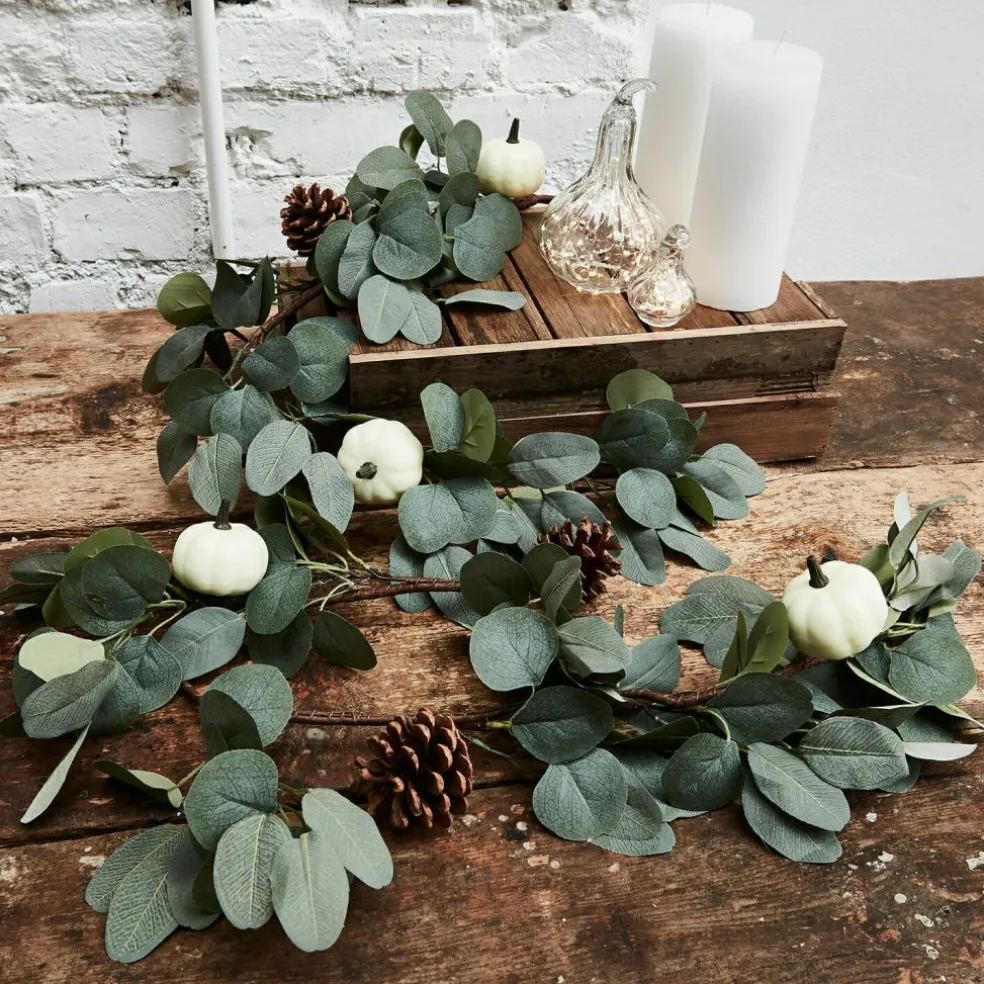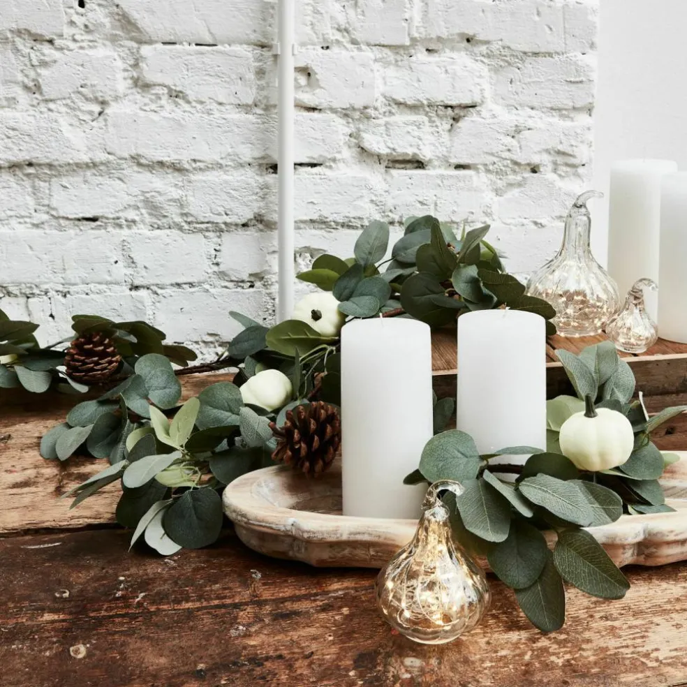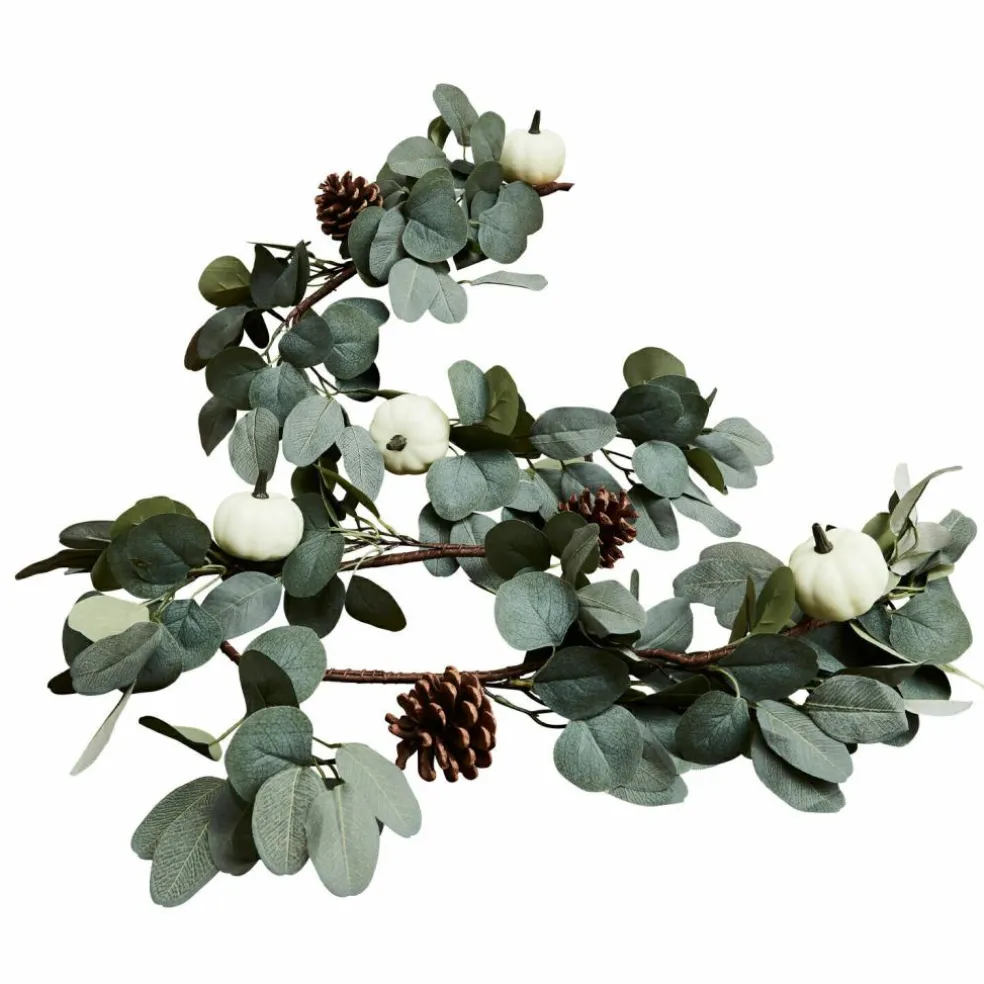 Fangen Sie die Schönheit des Herbstes ein und lassen Sie dem Kürbis als das Herbst-Symbol überhaupt den großen Auftritt. Bei dieser reizenden Girlande ist er in Form hübscher, kleiner Deko-Kürbisse vertreten. Dazu gesellen sich echte Tannenzapfen und weiche Deko-Blätter. Die großzügige Girlande lässt sich wunderbar um eine Kaminkonsole, am Fenster oder auch um den Türrahmen drapieren – hier können Sie völlig kreativ werden. Zum Beispiel zum Landhaus-Stil gelingt hiermit ein sehr harmonischer Effekt, der jedes Ambiente verschönert. Die niemals welkende Girlande können Sie jahrelang immer wieder verwenden, ohne dass sie an Frische verliert. Sie ist immer eine Freude.