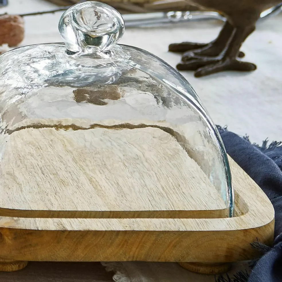 Schmücken Sie Ihren Speisetisch oder das Buffet mit diesem anspruchsvollen 2er Set aus Glasglocken und passenden Mangoholz-Platten. Die behutsam gehämmerten Glasglocken sind nicht nur eine Schutzabdeckung für feinen Käse oder frisches Gebäck, sondern ein kunstvolles Statement, das durch das Spiel von Licht und Textur besticht. Jede Holzplatte erzählt mit ihrem natürlichen Finish und der deutlich sichtbaren Maserung ihre eigene Geschichte und fügt jedem Arrangement einen Hauch von Erdverbundenheit hinzu. Dieses Set kombiniert Form und Funktion auf elegante Weise und ist damit perfekt geeignet, um Ihre kulinarischen Kreationen oder geliebten Sammelstücke angemessen zu inszenieren.