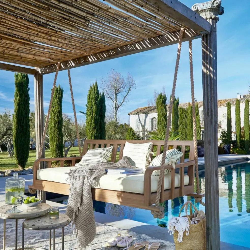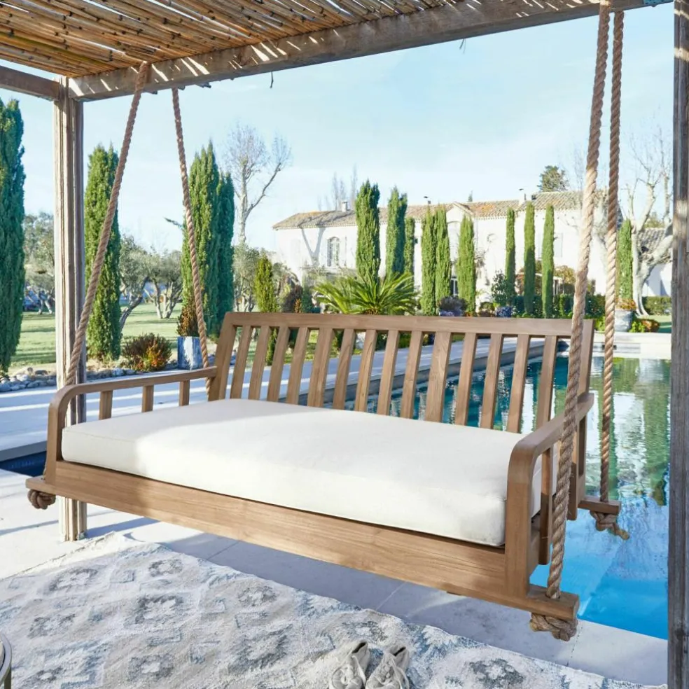 Einfach mal die Füße und die Seele baumeln lassen: Mit dieser wundervollen Hängebank genießen Sie unbeschwerte Stunden im Freien. Die schicke Entspannungsinsel kann einfach mit den festen Jutekordeln, die nach oben hin zusammenlaufen, an Holzvorsprüngen oder an einer Decke befestigt werden. Für das Gefühl der schwebenden Leichtigkeit sorgen auch die wunderbar weichen Kissen mit ihren Bezügen aus Olefinfasern. Sie sind abziehbar und waschbar, brauchen aber im Grunde kaum Pflege, denn das Material ist sehr widerstandsfähig. So wie auch das Teakholz, aus dem die Hängebank besteht. Es besticht nicht nur durch seine aparte natürliche Maserung, sondern eben auch durch seine Robustheit, mit dem es Wind und Wetter trotzt. Definitiv ein Schmuckstück, mit dem Sie über Jahre hinweg viel Freude haben werden. Freuen Sie sich auf traumhafte Augenblicke: Sonnen Sie sich leicht wiegend und sehen Sie dabei den Schmetterlingen in Ihrem sommerlichen Garten zu. Oder genießen Sie stimmungsvolle Momente mit Ihrer Familie oder einen Abend mit Ihren besten Freunden – und stoßen Sie an auf beschwingte Zeiten.