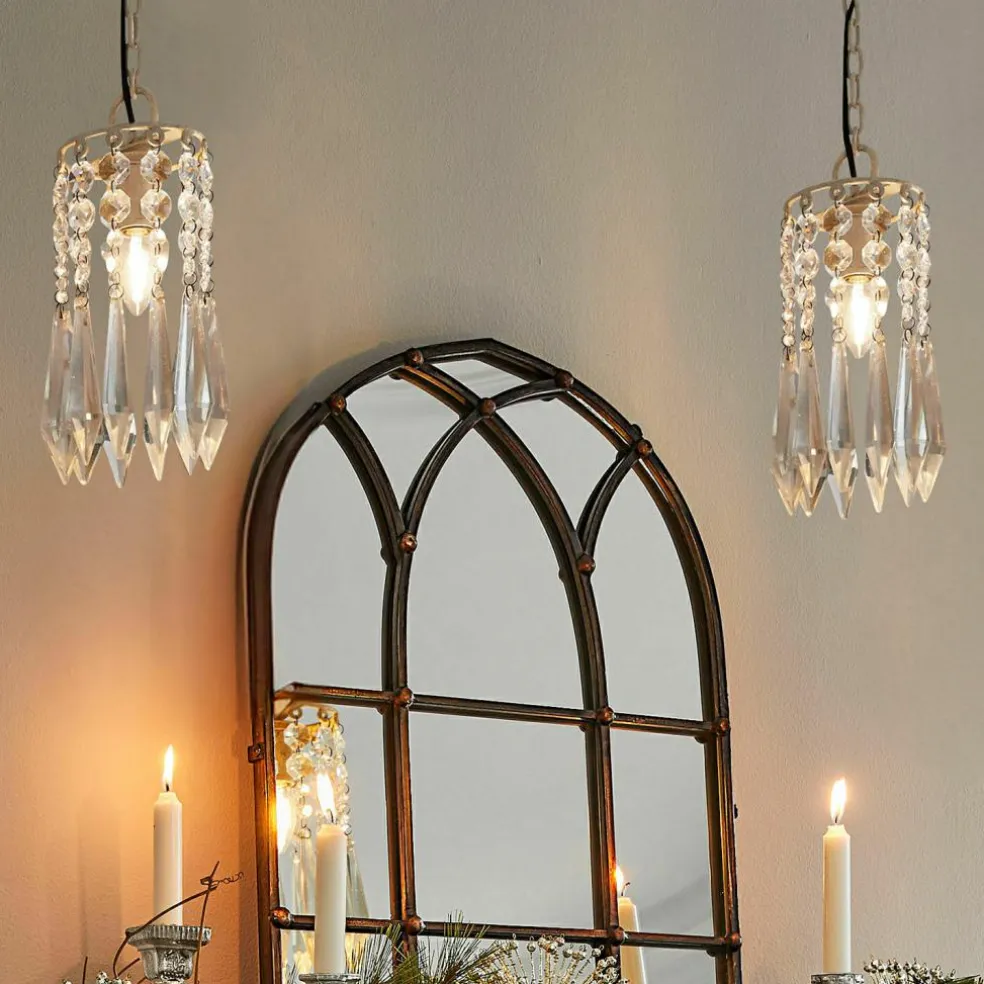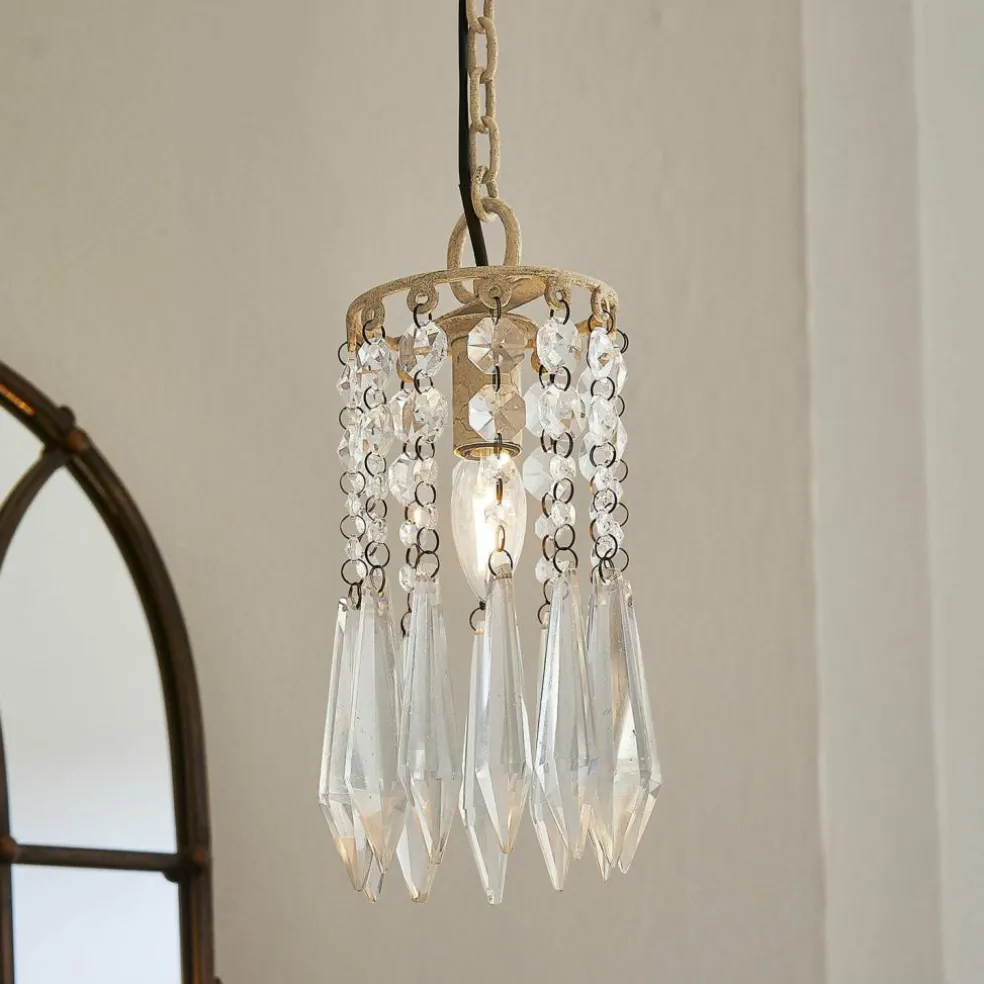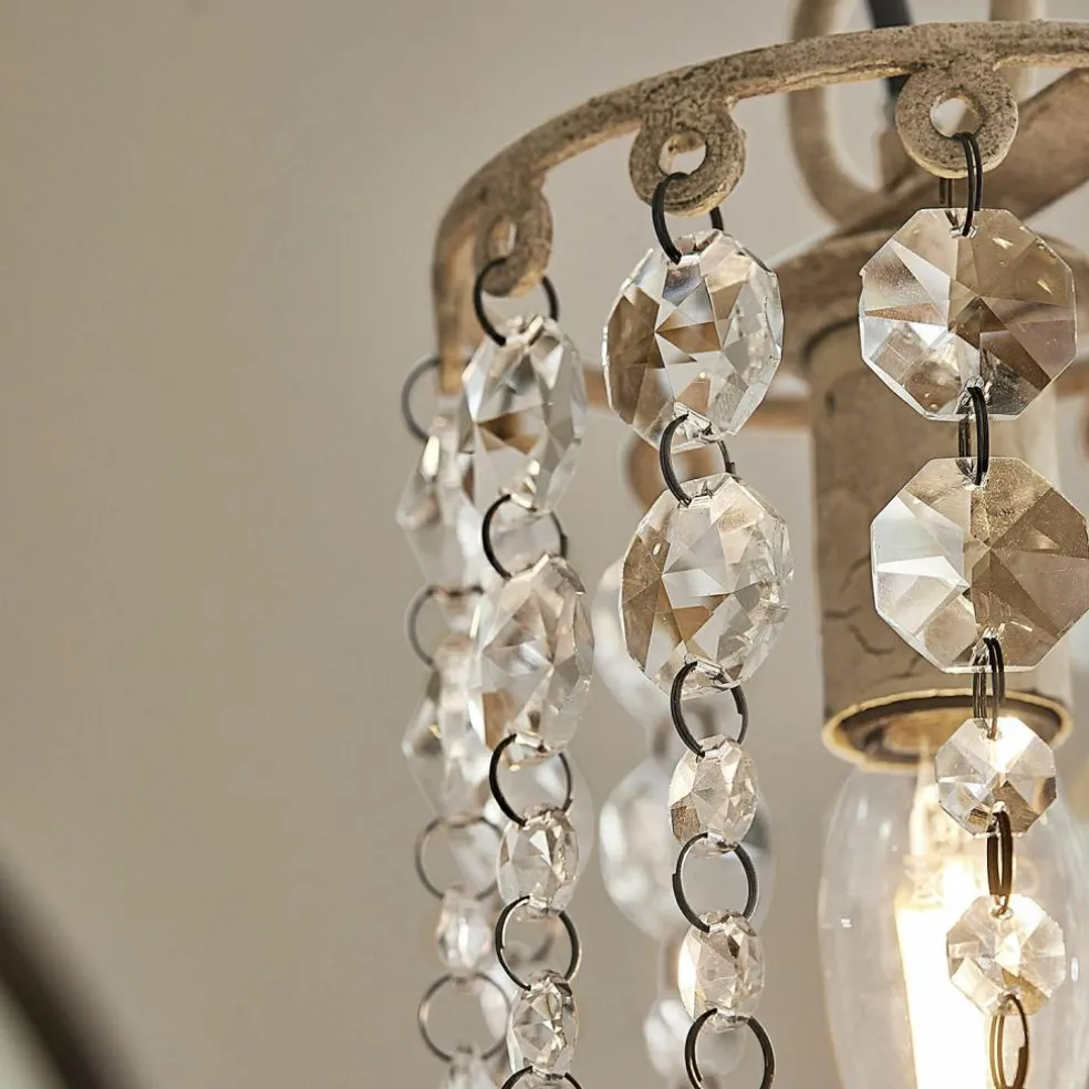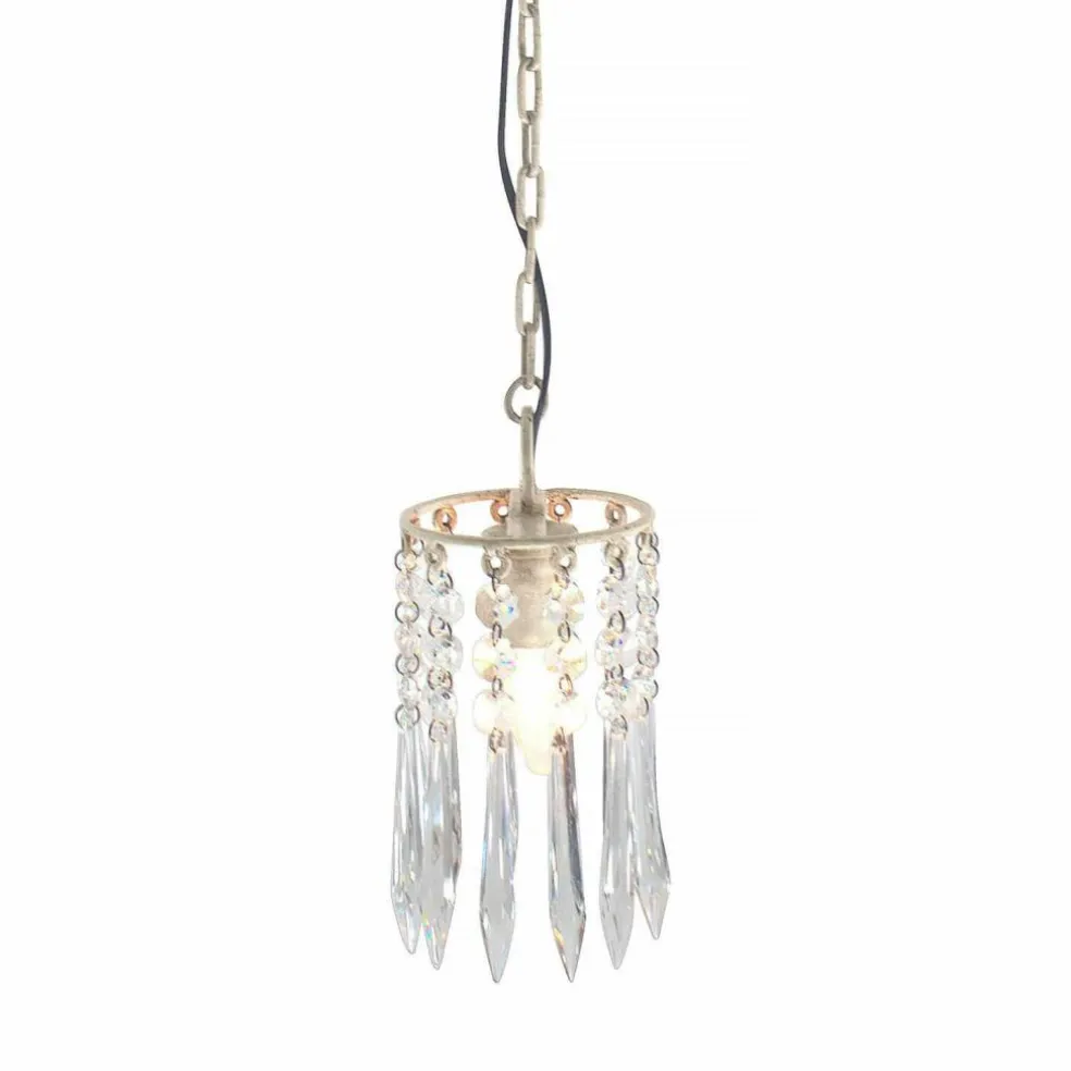 Erleben Sie die perfekte Kombination aus handwerklicher Kunst und zeitloser Eleganz mit dieser exquisiten Hängelampe. Das filigrane Metallgestell, liebevoll mit einem antiken Finish versehen, strahlt eine nostalgische Anmut aus. Die prächtig funkelnden Glasanhänger fangen das Licht auf atemberaubende Weise ein und sorgen für faszinierende Reflexionen. Diese Lampe ist mehr als nur eine Lichtquelle – sie ist ein Kunstwerk, das Ihren Raum in ein warmes, einladendes Ambiente hüllt und gleichzeitig als Blickfang dient. Perfekt für stilvolle Wohn- und Essbereiche, verleiht sie jedem Raum eine besondere Note.