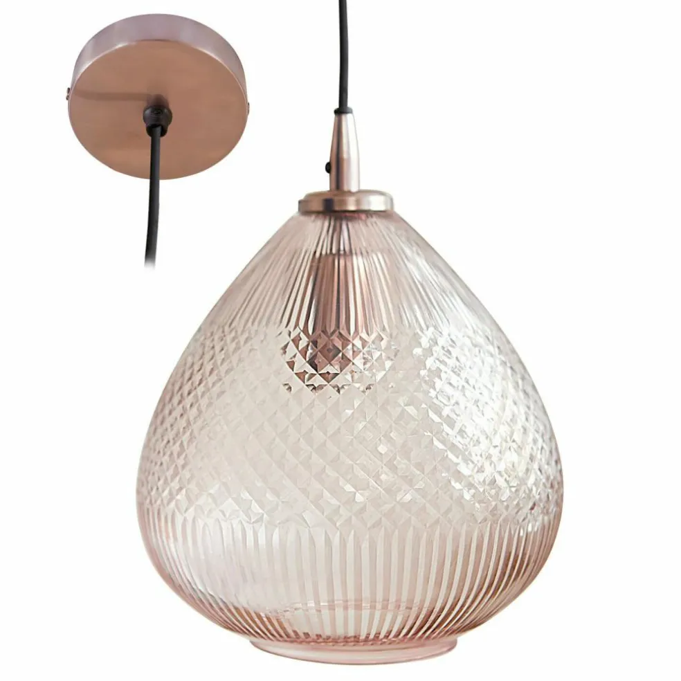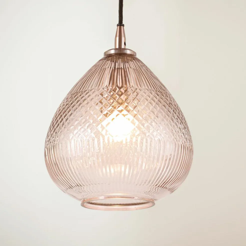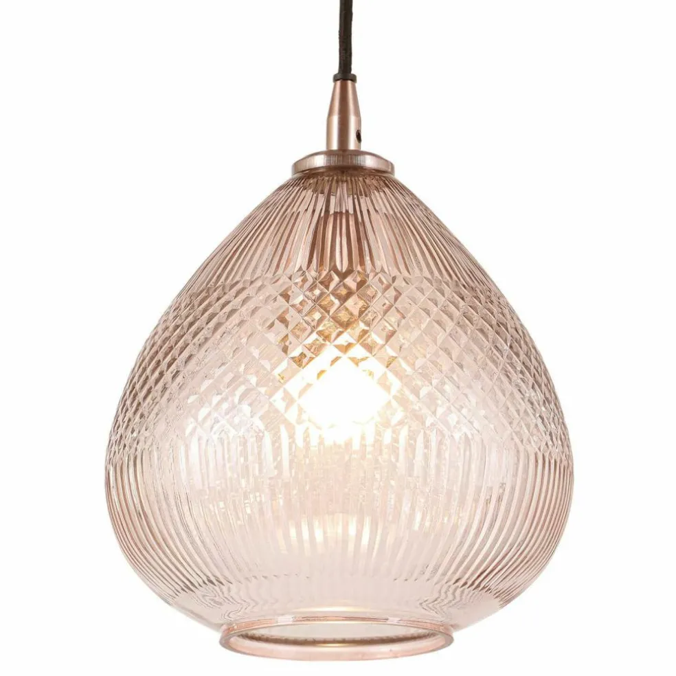 Diese Hängelampe lässt alle Liebhaber edler Antiquitäten sofort an berühmte Vorbilder aus den 20er Jahre des letzten Jahrhunderts denken, die sich für ihre Entwürfe mal beim fantasievoll beschwingten Jugendstil, mal beim französischen Art Deco bedienten und deren Design in jeder Beziehung einzigartig war. Das Glas wurde hier zu einer organischen Tropfenform geblasen und anschließend von Hand mit einem dekorativen Rillen- und Rautenschliff verziert, der für bezaubernde Lichtbrechungen und einen Hauch Glamour sorgt. Unterstützt wird der exklusive Look der Hängelampe durch die dezente Rosé-Tönung des Glases, die für eine besonders anheimelnde Lichtstimmung im Raum sorgt und wunderschön mit dem hochglänzenden, ebenso roséfarbenen Finish des Baldachins harmoniert. Mit einer energiesparenden LED-Birne können Sie die stimmungsvollen Lichteffekte der Hängelampe stundenlang genießen.