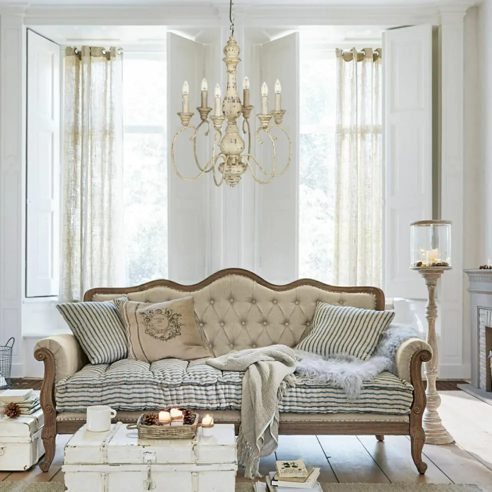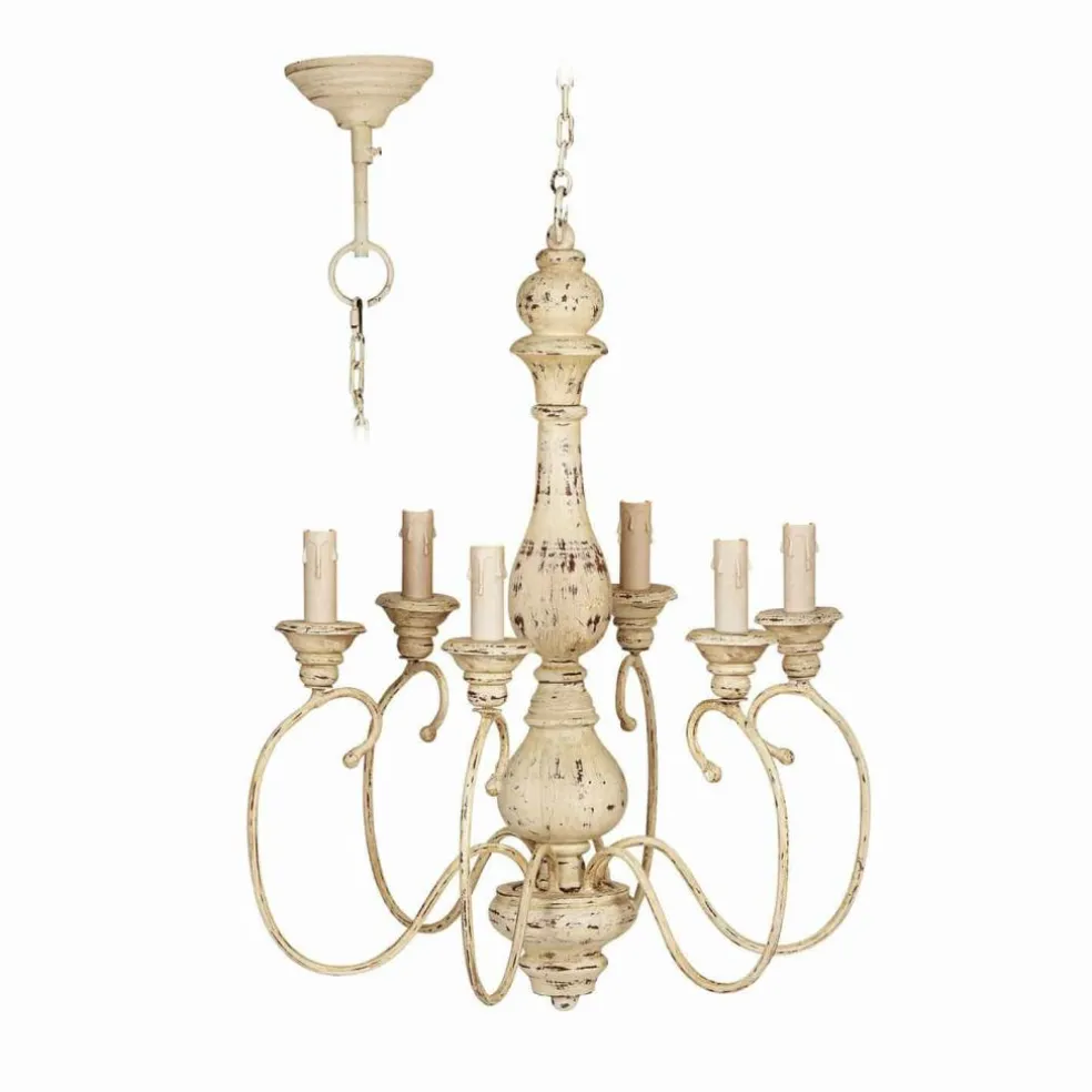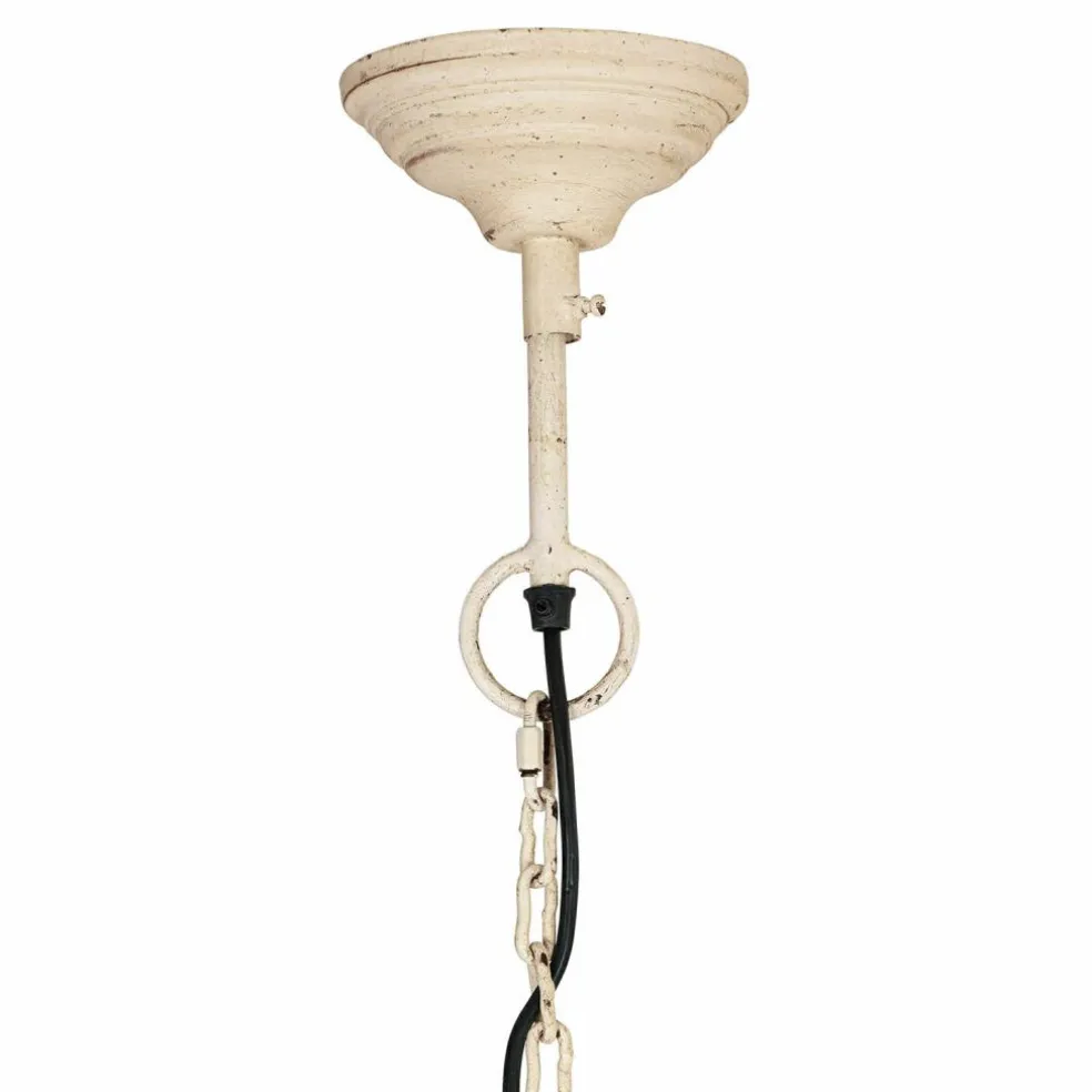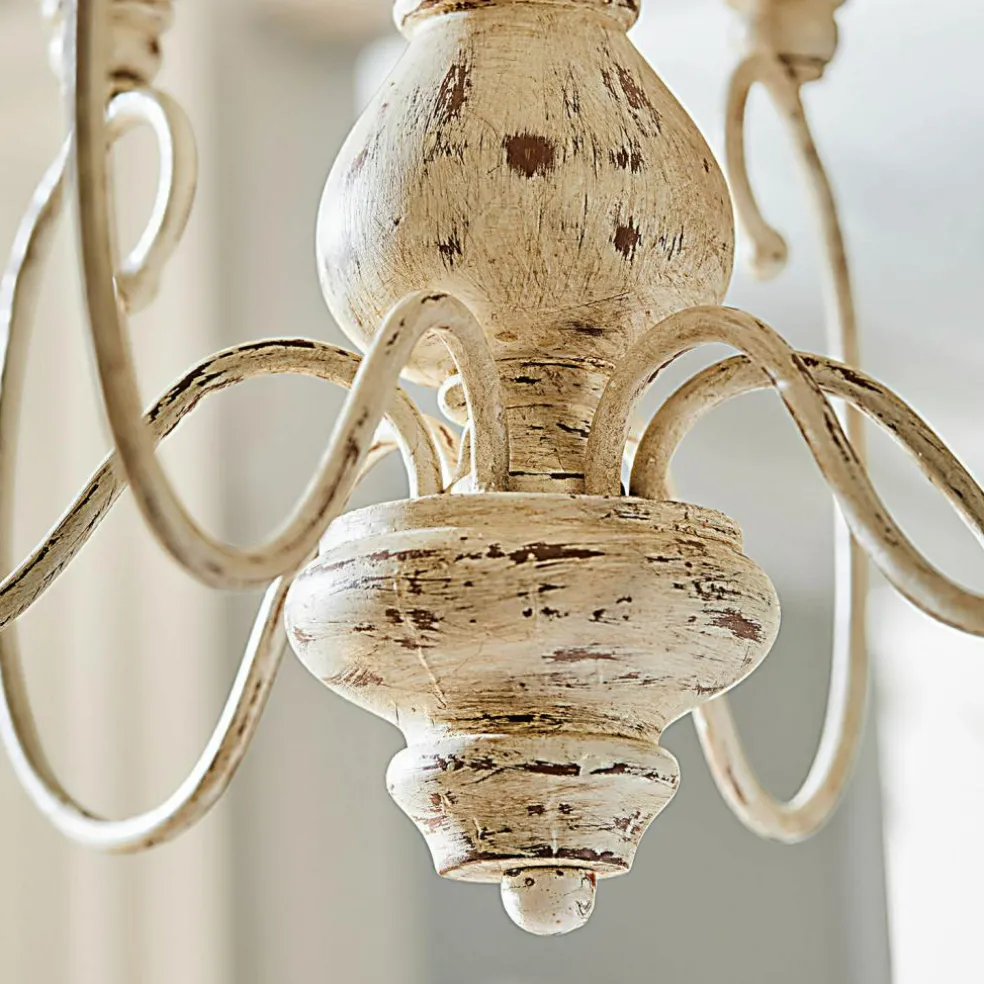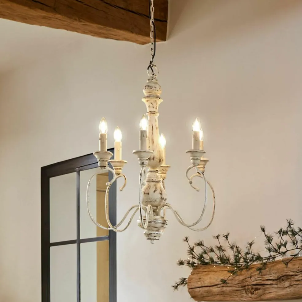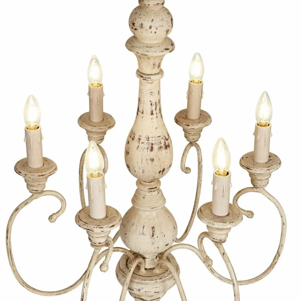 Bei dieser Hängelampe ist Detailliebe der Maßstab: Die arabesk geschwungenen, rankengleichen Formen aus Eisen, die Sockel, die aussehen wie Echtwachs-Kerzen, und das gekalkte Antik-Finish auf zauberhaft geformtem Mangoholz zaubern ein Kronleuchter-Kunstwerk mit Vintage-Feeling. Ein Schmuckstück für Ihren schönsten Raum, das für bewundernde Augen sorgen wird. Insgesamt sechs Fassungen für Leuchtmittel (exkl.) sorgen für ausreichend Licht im Raum. Wählen Sie am besten passende Leuchtmittel in Kerzenform, sodass der Eindruck eines antiken Leuchters noch intensiviert wird. Schmücken Sie mit diesem Eyecatcher den Eingangsbereich Ihrer vier Wände und ziehen Sie Ihre Gäste gleich beim Betreten Ihres Zuhauses in den Bann. Oder genießen Sie stimmungsvolle Momente im Glanzlicht dieses besonderen Schmuckstücks: beim Entspannen auf dem Sofa, in Ihrem Arbeitszimmer oder im Speisezimmer, während Sie mit Ihrer Familie stilvoll dinieren.