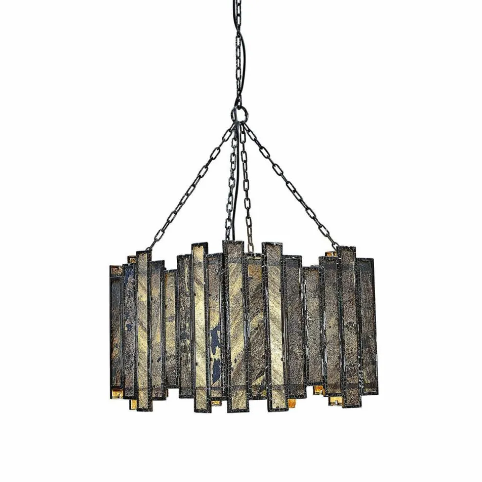 Mit dieser außergewöhnlichen Hängelampe holen Sie sich ein Stück puren Industrial-Chic in Ihr Zuhause. Das massive Eisengestell bildet einen spannenden Kontrast zu den hauchdünnen Steinplättchen, die rundherum in das Design eingearbeitet sind. Jedes der Plättchen besticht durch seine individuelle Struktur und Farbnuance, was der Lampe einen einmaligen Unikat-Charakter verleiht. Das antikschwarze Finish des Gestells und Baldachins verleiht der Leuchte eine besondere Patina, die den Look eines kostbaren Fundstücks aus vergangener Zeit hervorruft. Ob über dem Esstisch oder im Wohnzimmer – diese Hängelampe setzt in jedem Raum ein stilvolles Statement.