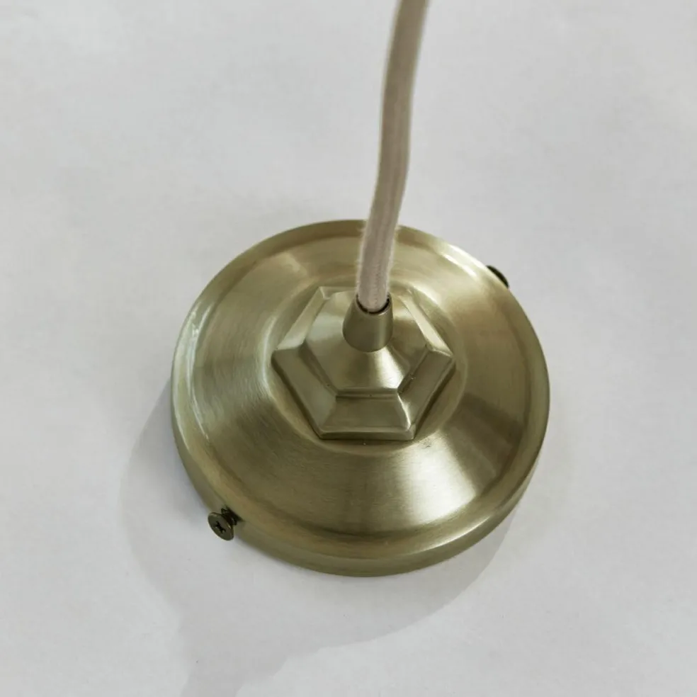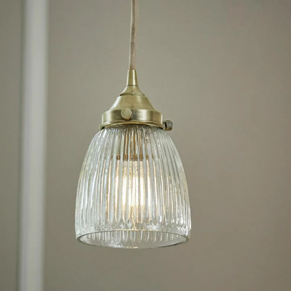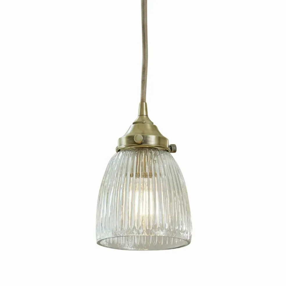 Diese wunderhübsche Hängelampe erinnert romantisch an frühere Zeiten. Sie hat einen schönen Schirm aus hochwertigem Holophanglas mit feinen Riffelungen, der sehr gut mit dem Gestell aus antikmessingfarbenem Eisen harmoniert. Ein elastisches Kabel in dezentem Farbton komplettiert dieses charmante Design. Es erinnert ein wenig an eine Industrie-Hängelampe im französischen Fabrikstil und macht sich sehr gut im Schlafraum, dem Home Office oder natürlich auch im Wohnzimmer, wo hiermit ein nostalgischer Akzent einzieht.
