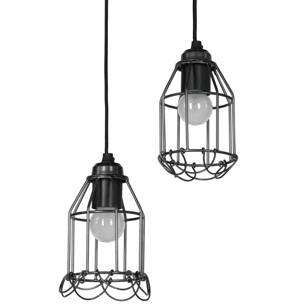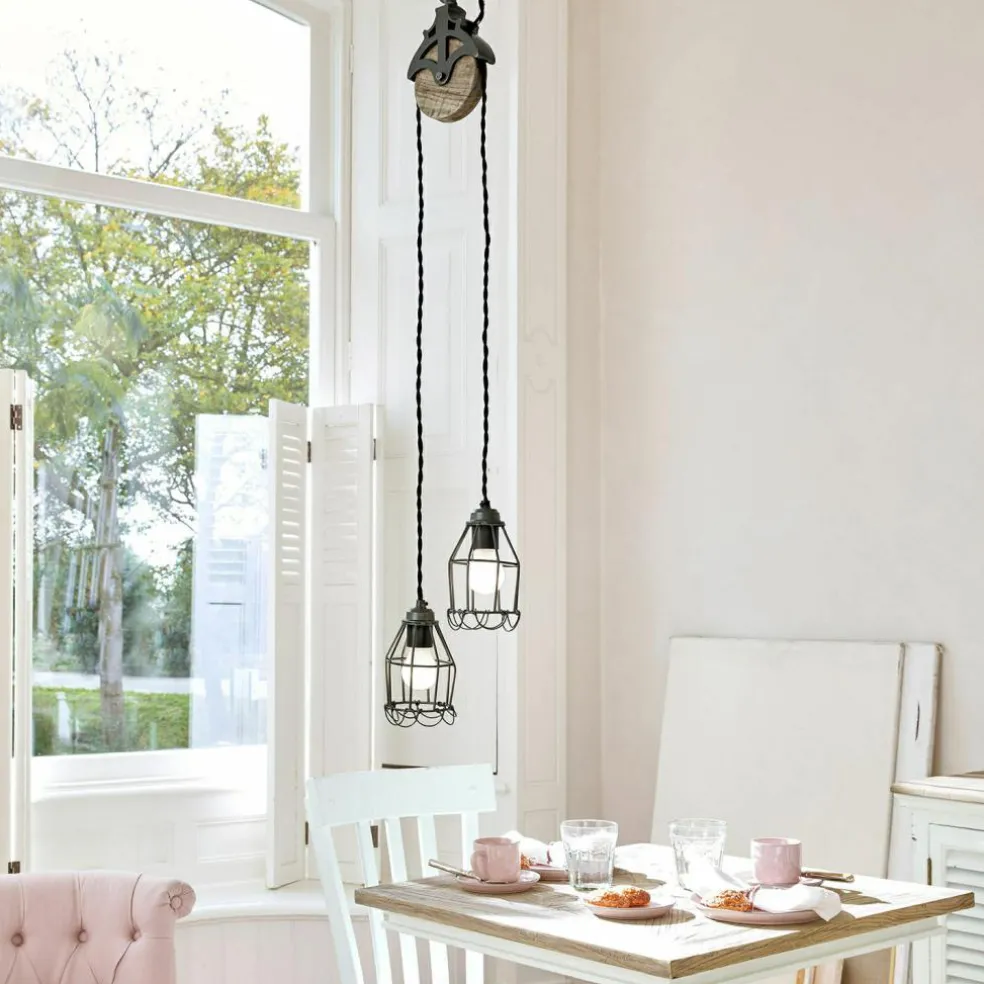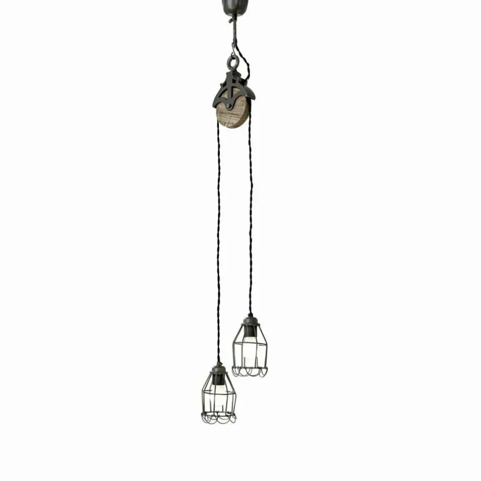 Bringen Sie einen Hauch von industriellem Flair in Ihr Zuhause mit dieser einzigartigen Hängelampe. Die Lampe kombiniert das robuste Aussehen von dunkel lackierten Metallkäfigen mit der warmen, natürlichen Textur eines dekorativen Holzrads. Jedes Detail dieser Lampe ist durchdacht – von den gedrehten Kabeln bis hin zur fixierten Position der Leuchtmittel, die ein harmonisches Lichtspiel erzeugen. Das Holzrad dient hierbei als dekoratives Element, das dem Design zusätzlichen Charakter verleiht, ohne die Funktionalität zu beeinflussen. Perfekt geeignet, um über einem Esstisch, in einem Loft oder einem Wohnzimmer im Industrial-Stil einen besonderen Akzent zu setzen.