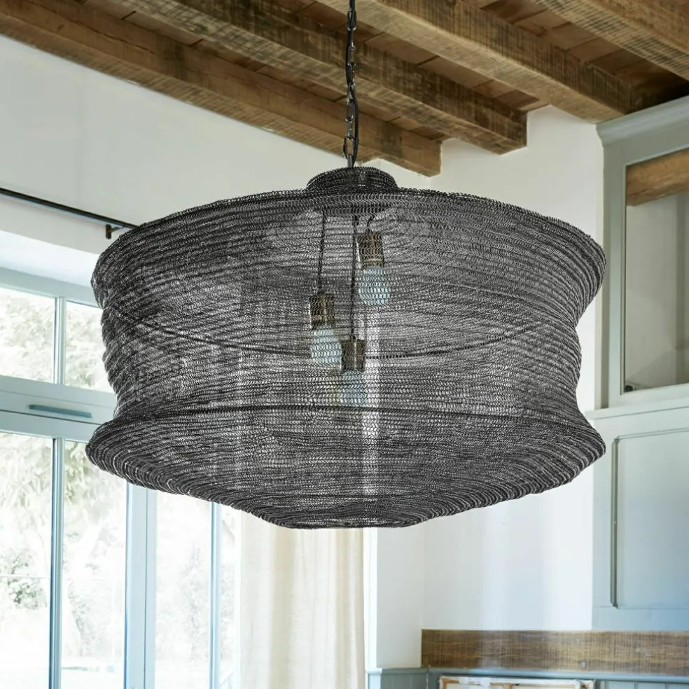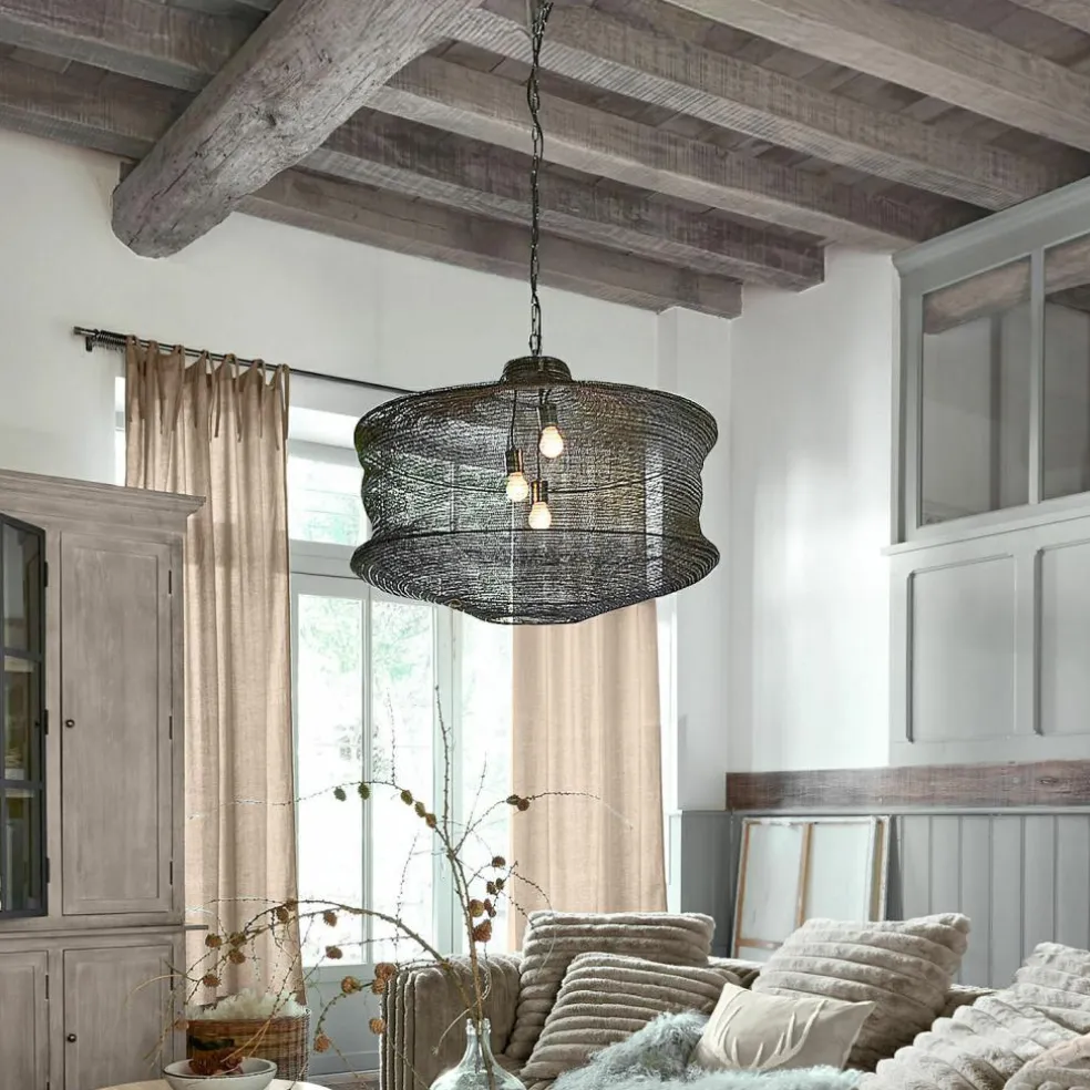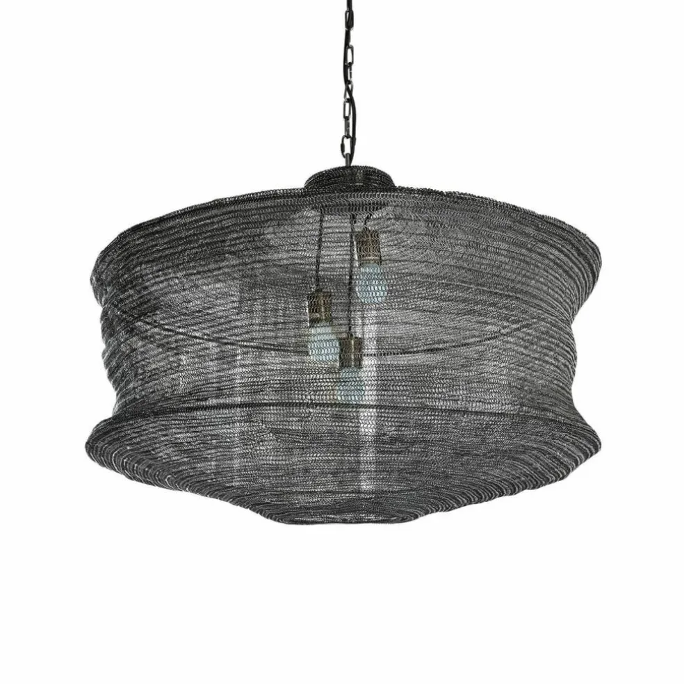 Die majestätische Hängelampe aus aufwendig geflochtenem Eisen ist ein wahres Meisterwerk der Handwerkskunst. Ihr imposantes Design, das durch das Antikschwarz-Finish veredelt wird, strahlt eine ganz besondere Eleganz aus, die jeden Raum in ein stilvolles Ambiente verwandelt. Die sorgfältige Flechttechnik des Eisens erzeugt faszinierende Licht- und Schattenspiele, die eine warme und einladende Atmosphäre schaffen. Ob über dem Esstisch, im Wohnzimmer oder im Eingangsbereich – diese Lampe zieht alle Blicke auf sich und setzt ein beeindruckendes Statement.