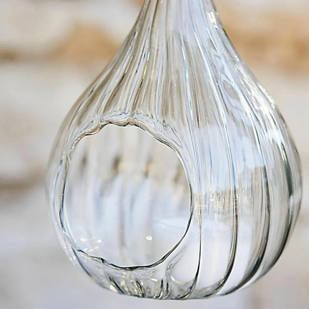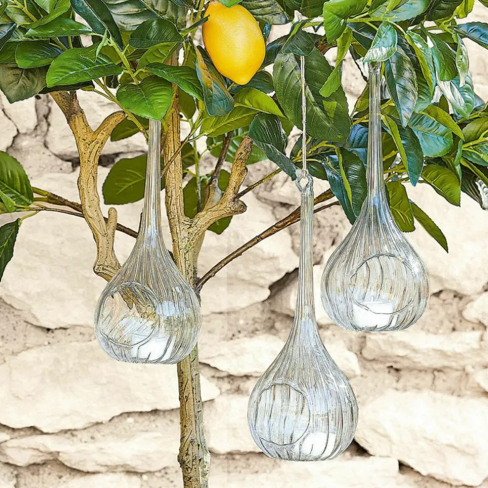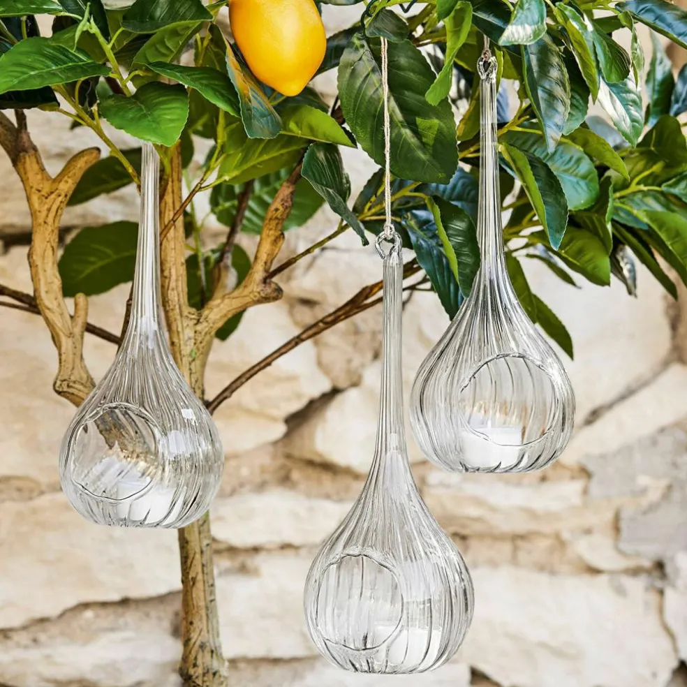 Diese filigranen und ganz zauberhaften Hängewindlichter bringen wundervolle Deko-Akzente in den Garten oder Ihr Heim. Sie sind aus fein mundgeblasenem Glas mit zarter Riffelung und haben eine Öffnung für Teelichter oder Dekoratives. Ein Bändchen zum Aufhängen aus natürlicher Jute ist schon dabei, und so können sie an einem Haken, Dachbalken oder in Zweigen im Garten ihren Charme spielen lassen. Genießen Sie eine reizende Beleuchtung sowie eine sehr liebevolle und leichte Dekoration im Trio, die wirklich zu jedem Ambiente eine Freude ist.