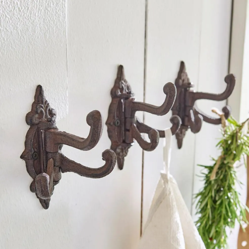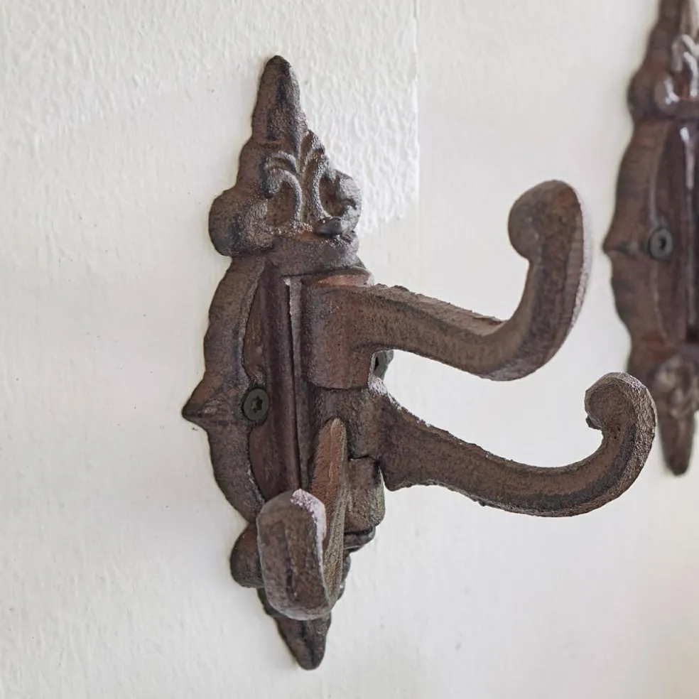 Reines Gusseisen macht diesen Dreifach-Wandhaken nicht nur äußerst robust, sondern auch wunderschön. Der antik wirkende Oberfläche bringt die kunstvollen Details besonders zur Geltung. Die drei Haken sind horizontal in einem Winkel von ca. 180° Grad beweglich. So lassen sich gleich mehrere Kleidungsstücke ganz bequem und ohne große Umstände aufhängen. Überall wo Haken von Nutzen sind, ziert dieses Exemplar Ihre Wände, ob Küche, Bad oder Flur.