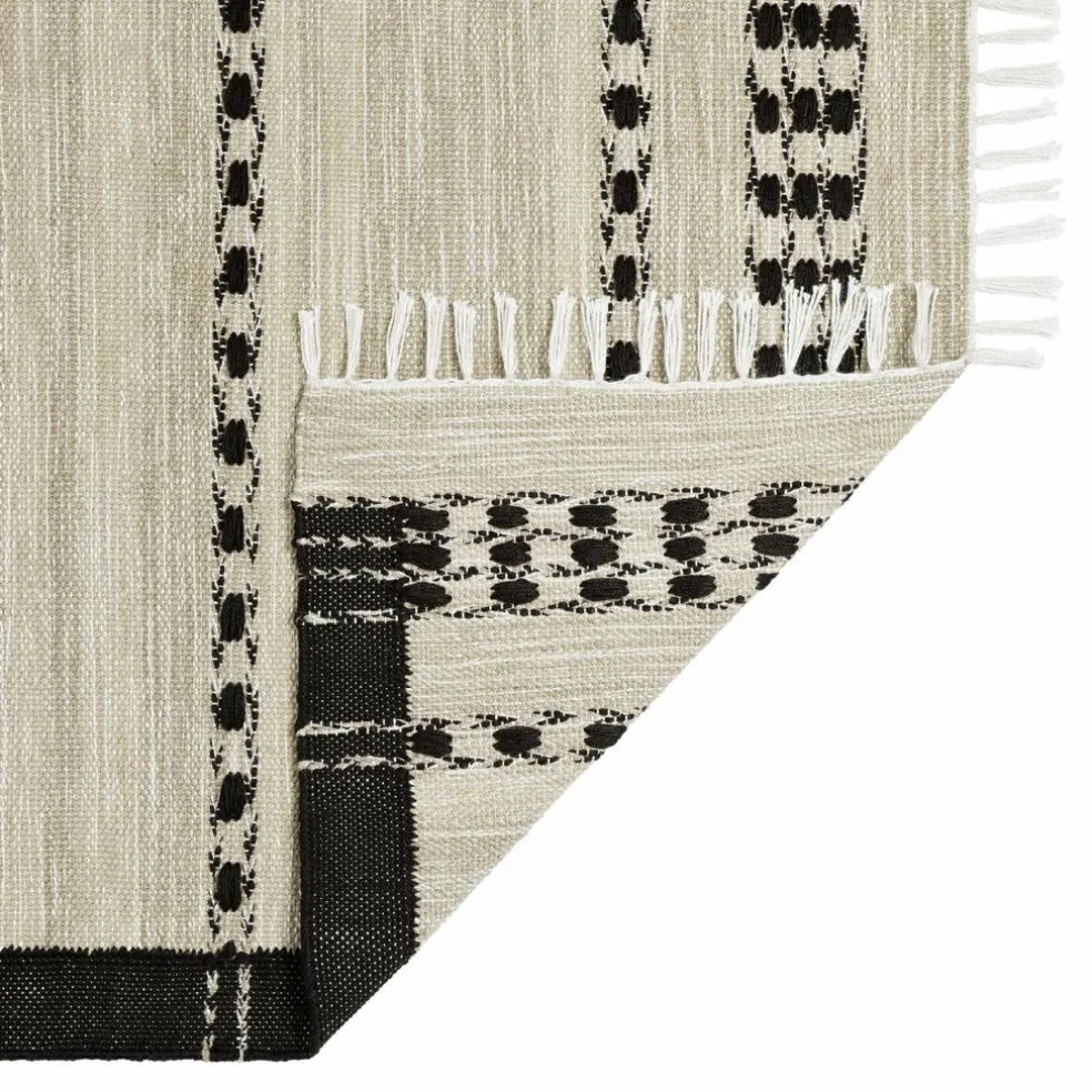 Dieser kunstvoll von Hand gewebte Teppich verbindet umweltbewusste Materialwahl mit eleganter Ästhetik. Aus recyceltem PET gefertigt, bietet er die Haptik eines traditionellen Baumwollteppichs und hält gleichzeitig den Elementen stand. Die naturnahen Farben und das dezente Muster komplementieren sowohl Innenräume als auch Außenbereiche und verleihen ihnen eine entspannte, bohèmeartige Ausstrahlung. Dieser Teppich ist ein Statement für umweltfreundliches Design und vielseitigen Stil, ideal für alle, die Wert auf Nachhaltigkeit und Eleganz legen.