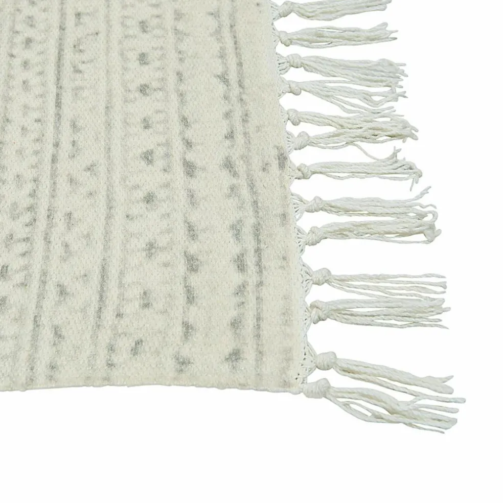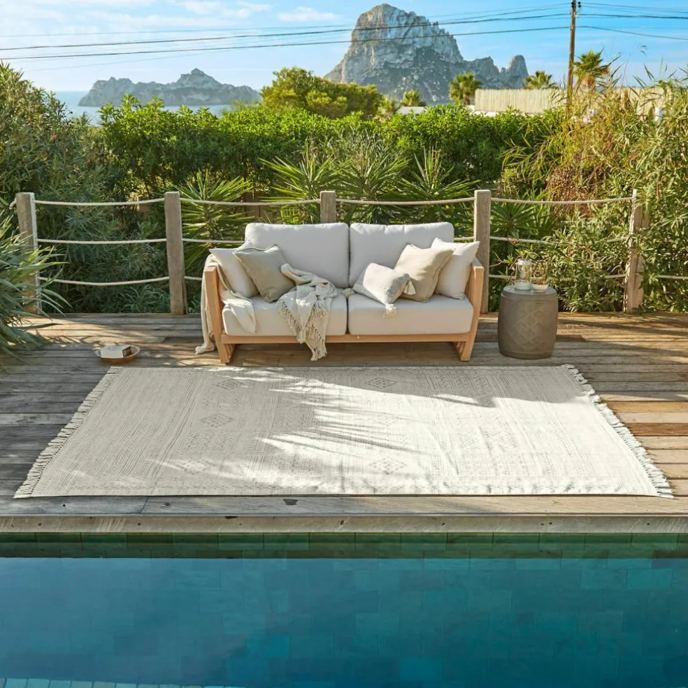 Dieser Teppich vereint Ästhetik und Nachhaltigkeit auf beeindruckende Weise. Gefertigt aus wiederaufbereitetem PET, bietet er eine umweltfreundliche Lösung für anspruchsvolle Wohnbereiche – sowohl drinnen als auch draußen. Sein kunstvolles Aztekenmuster mit geometrischen Details verleiht jedem Raum eine Prise Boho-Charme und sorgt für visuelle Harmonie. Die weiche Haptik lädt dazu ein, barfuß über den Teppich zu gehen, während das robuste Material auch in Außenbereichen problemlos bestehen kann. Die Fransen an den Enden verleihen dem Teppich eine lässige, handwerkliche Optik, die sich mühelos in verschiedene Einrichtungsstile integriert und sowohl auf Terrassen als auch im Wohnbereich für eine behagliche Atmosphäre sorgt.