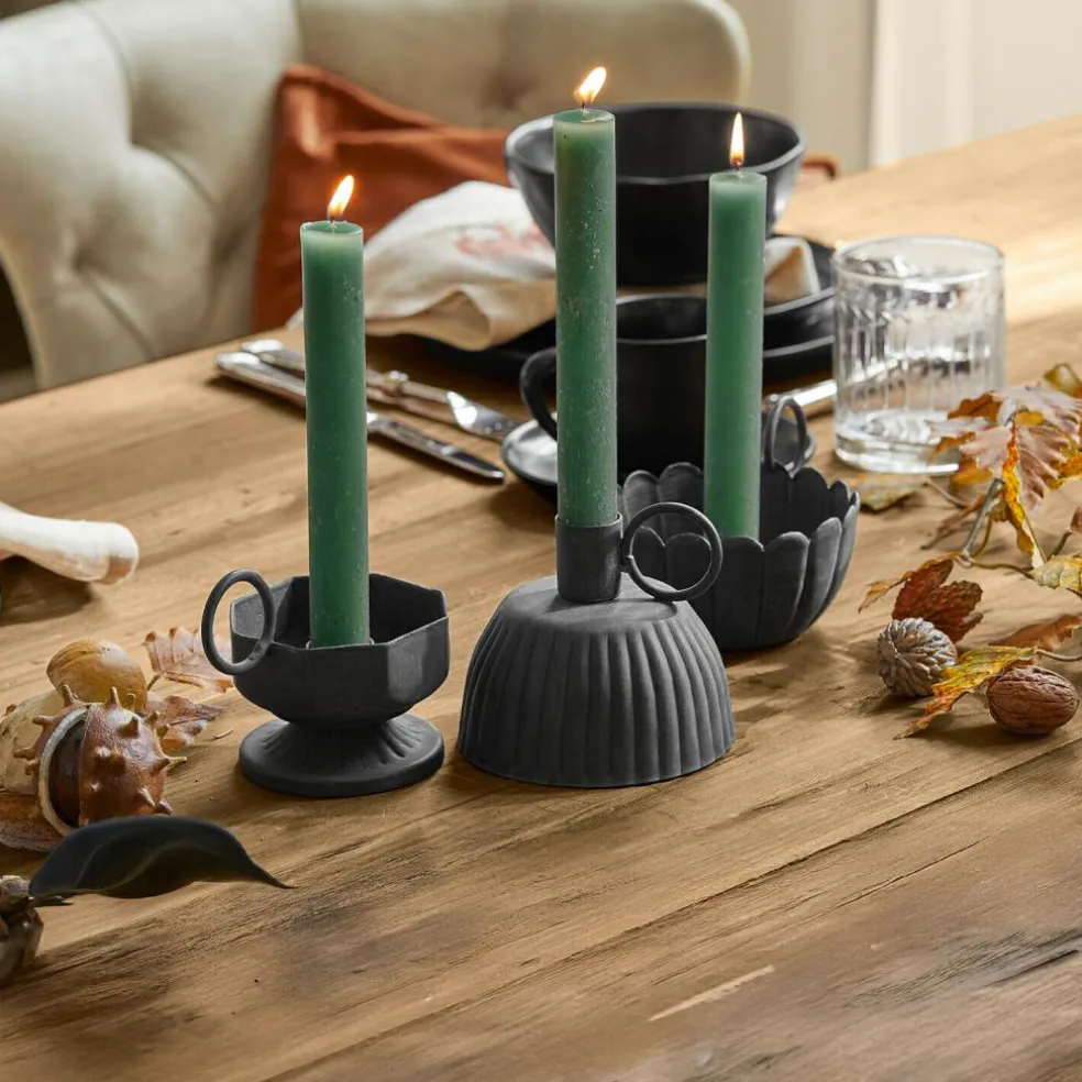 Dieses außergewöhnliche 3er-Set ist ein echtes Statement für Liebhaber individueller Details. Jeder Halter hat seine ganz eigene Formsprache: mal grafisch und kantig, mal rund mit weicher Wellenstruktur oder fein gerillt wie eine nostalgische Backform. Gemeinsam sind ihnen die mattschwarze Oberfläche und der stabile Eisenkörper, der sich angenehm kühl und solide anfühlt. Der angedeutete Tragring verleiht jedem Stück eine klassische Anmutung, fast wie aus einem alten Film. Ob auf dem gedeckten Tisch, im Regal oder auf dem Kaminsims – diese Kerzenhalter schaffen ein ruhiges, fast poetisches Lichtspiel und bringen eine dunkle Note voller Ausdruck ins Zuhause.