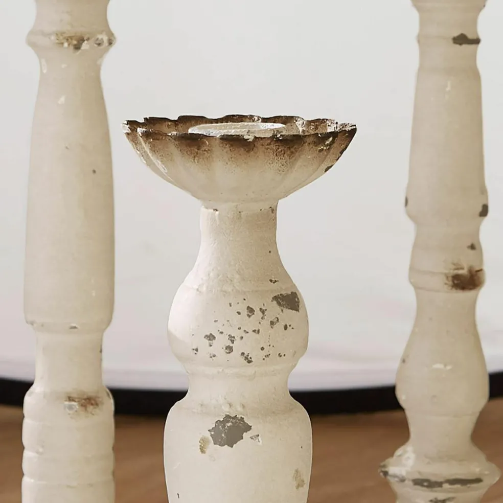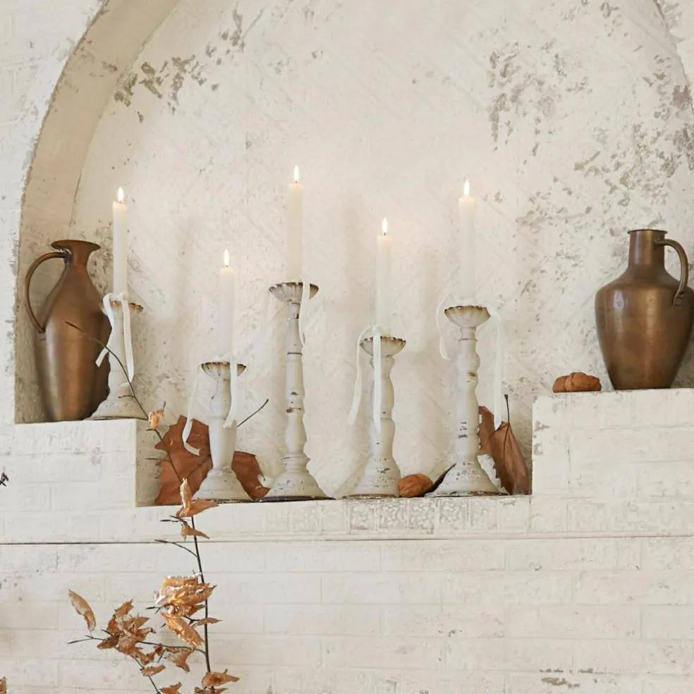 Kerzenlicht schafft eine besondere Atmosphäre – und mit diesem Set aus sechs kunstvoll gestalteten Kerzenhaltern wird sie noch stimmungsvoller. Die formschönen Leuchter erinneren an klassische Modelle vergangener Jahrhunderte, während das beeindruckende Antikweiß-Finish für einen authentischen Vintage-Look sorgt. Dezente Patina-Effekte und liebevoll gesetzte Gebrauchsspuren verleihen jedem Stück seinen ganz eigenen Charakter. Gefertigt aus stabilem Eisen, bieten die Halter eine sichere Basis für Stabkerzen und lassen sich wunderbar miteinander kombinieren. Ob auf dem Esstisch, der Konsole oder als dekoratives Ensemble auf dem Kaminsims – dieses Set setzt stilvolle Lichtakzente.