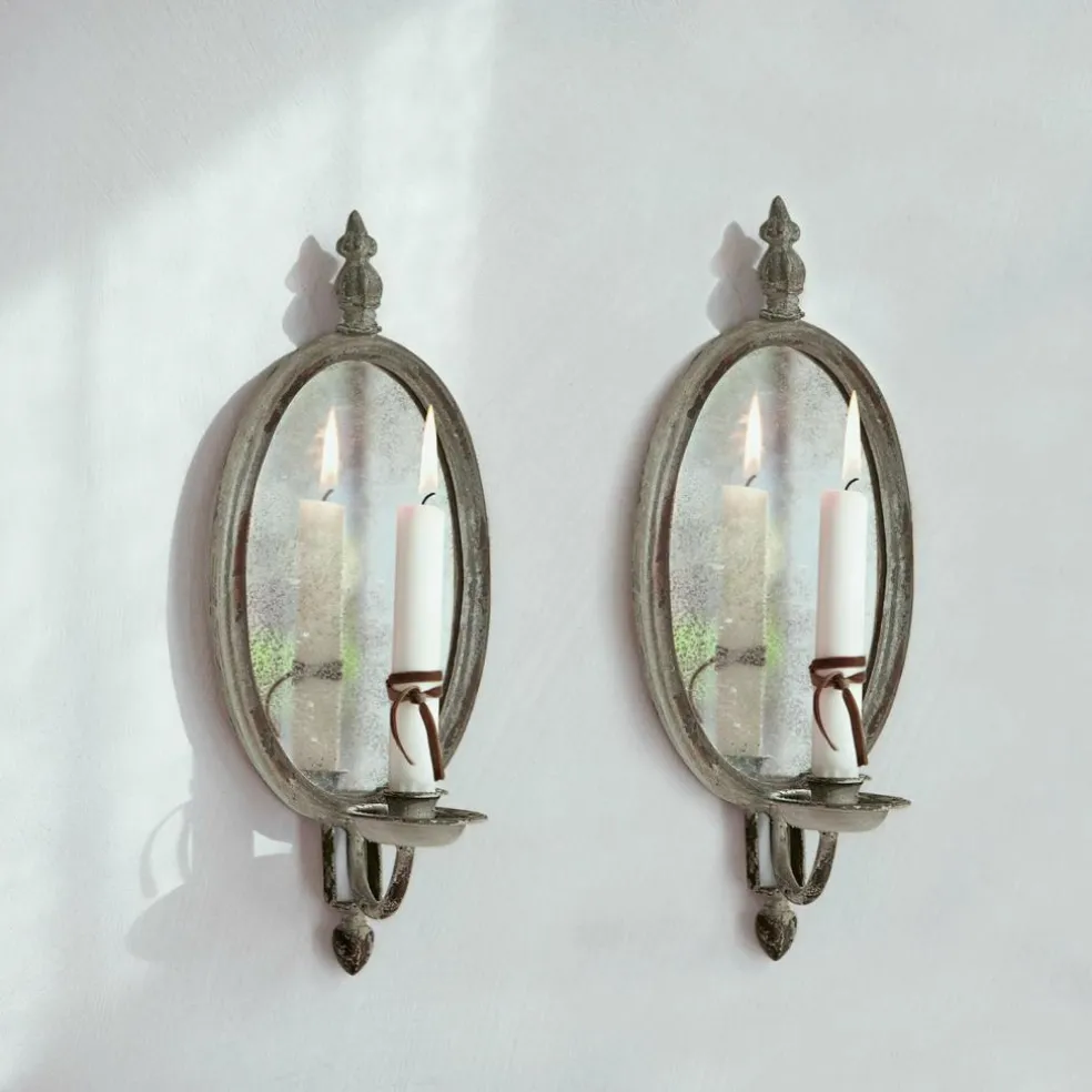 Wunderschön reflektiert wird das Licht einer Kerze mit diesem Kerzenhalter im Antik-Look. Der Kerzenhalter in Form eines Medaillons wird an die Wand angebracht. Der Rahmen aus Eisen besticht mit seinem antiken Charme und auch das Spiegelglas wirkt leicht angelaufen. Die tropfenförmigen Verzierungen am Rahmen verleihen dem Wandkerzenhalter seinen individuellen Look. Die Halterung für eine Stabkerze ist bogenförmig mit dem Eisenrahmen verbunden. Praktisch: Der Kerzenteller fängt tropfendes Wachs auf. Dank der originellen Verarbeitung ist dieses besondere Stück aber auch ohne leuchtende Kerze ein schöner Hingucker.